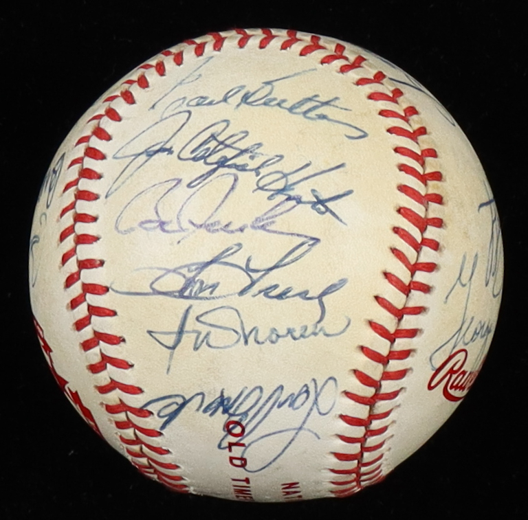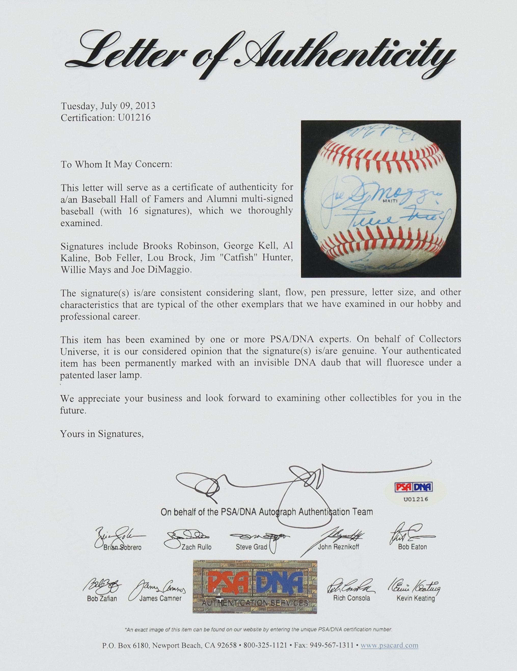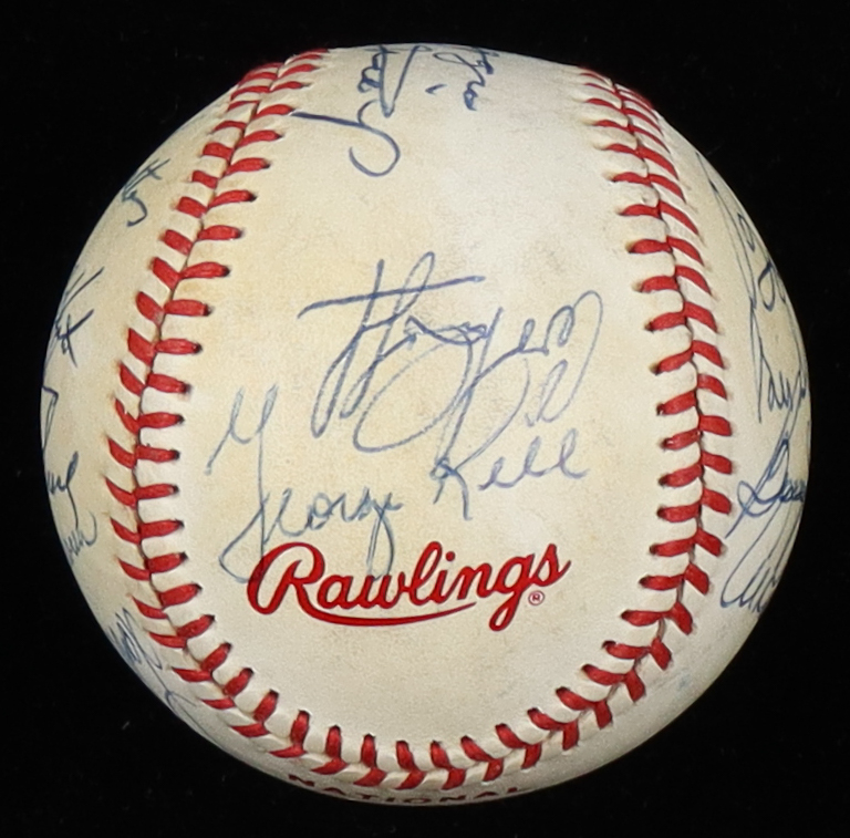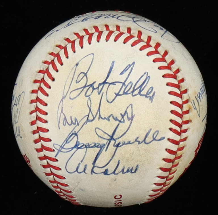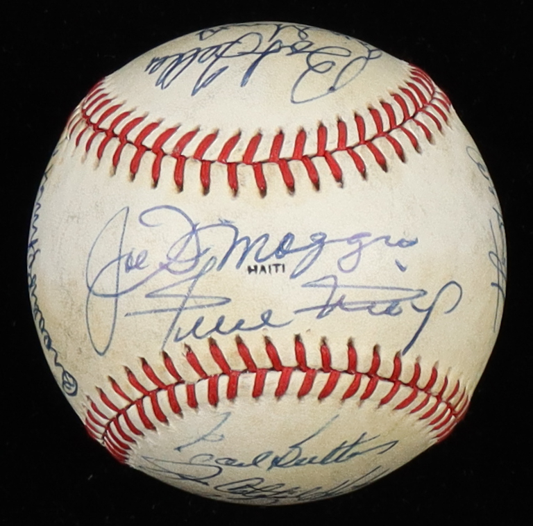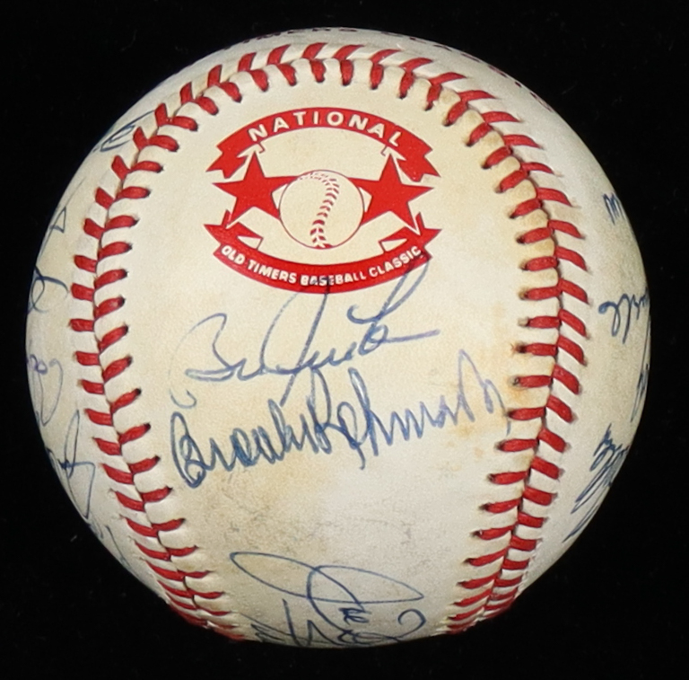 Rawlings Official National Old Timers Classic baseball. Hand-signed by (16), with Brooks Robinson (Baltimore Orioles, HOF), George Kell (D. 2009, Detroit Tigers, HOF), Al Kaline (D. 2020, Detroit Tigers, HOF), Bob Feller (D. 2010, Cleveland Indians, HOF), Lou Brock (D. 2020, St. Louis Cardinals, HOF), Jim "Catfish" Hunter (D. 1999, Oakland Athletics, HOF), Willie Mays (San Francisco Giants, HOF), Joe DiMaggio (D. 1999, New York Yankees, HOF), and (8) others.