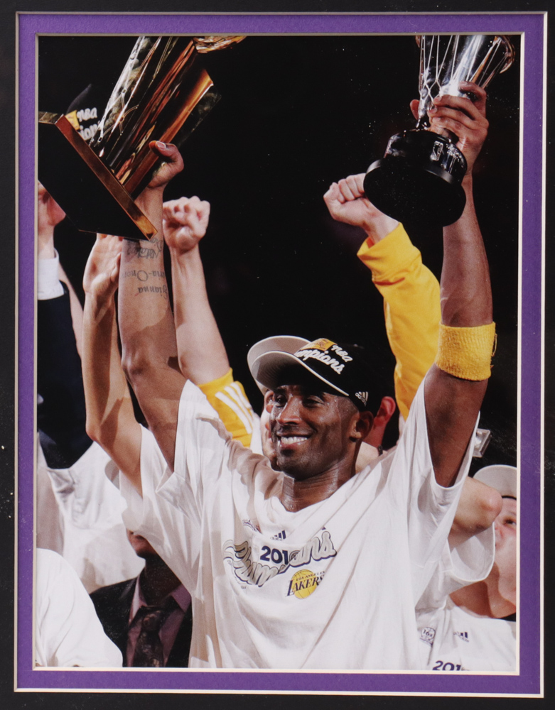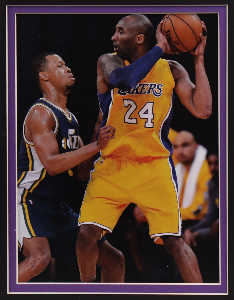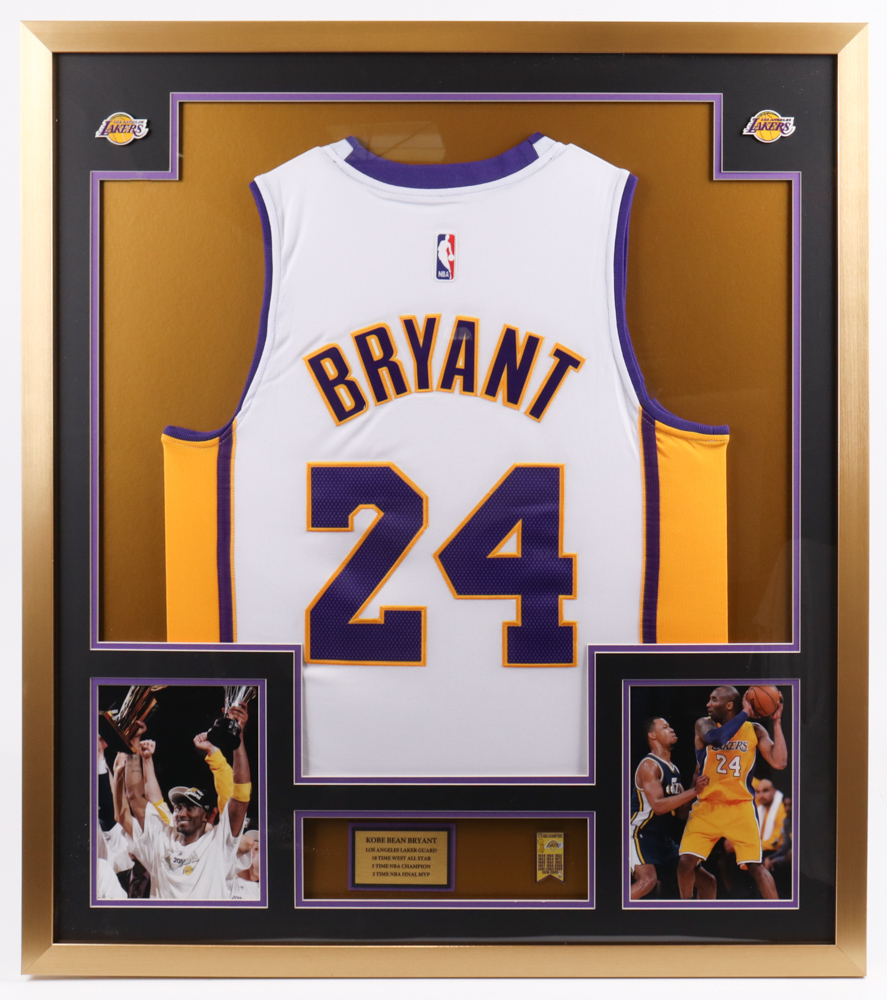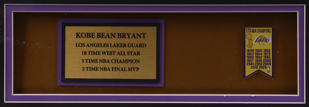 Custom frame measures 32" x 36" in size and features an unsigned Kobe Bryant jersey (Los Angeles Lakers), as well as a Lakers mini Championship Banner pin.