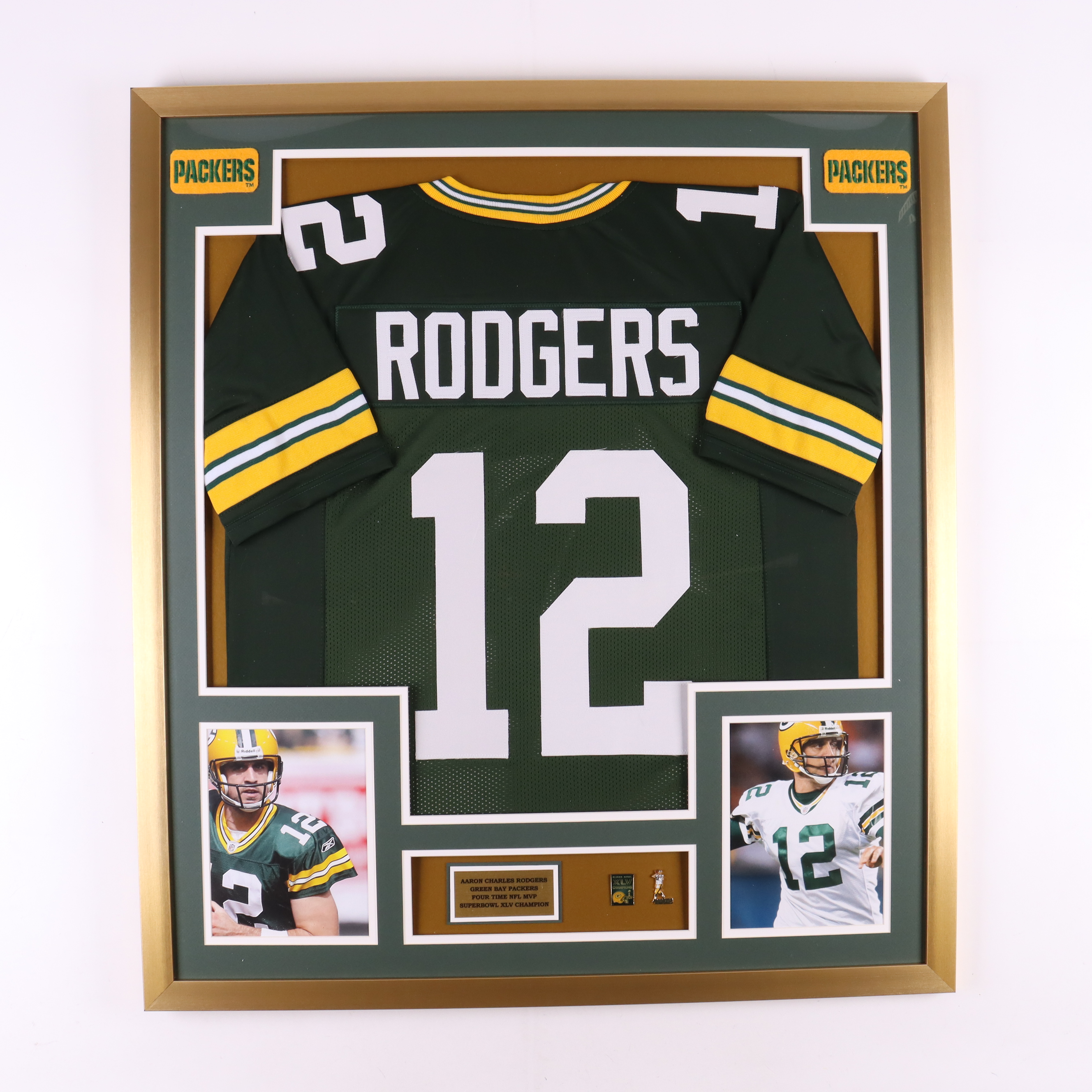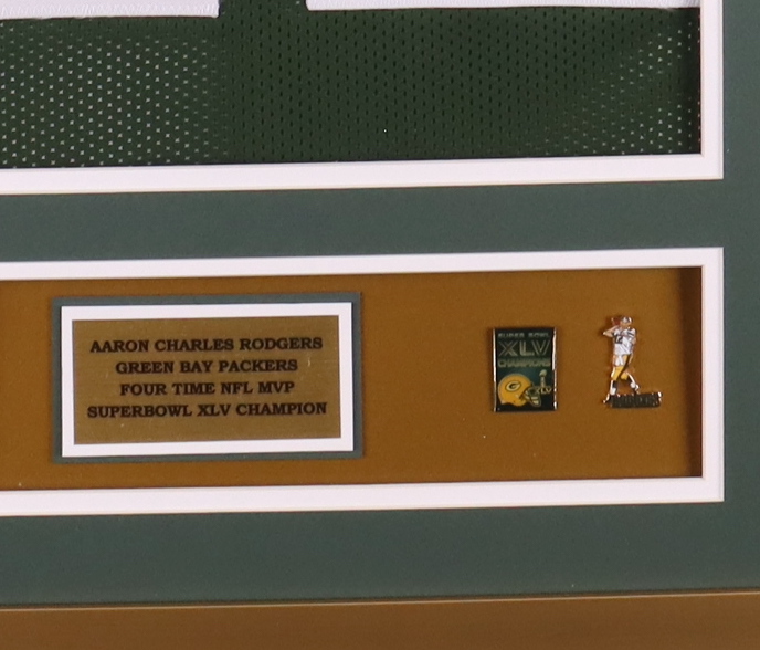 Custom frame measures 32" x 36" in size and features an unsigned Aaron Rodgers jersey (Green Bay Packers), as well as a set of (2) pins, with an official Super Bowl XLV pin and Rodgers pin.