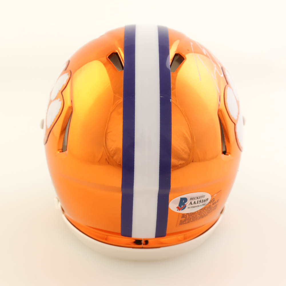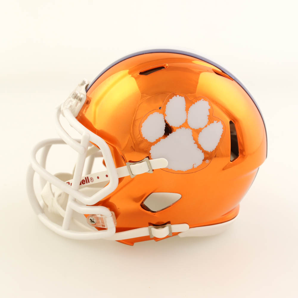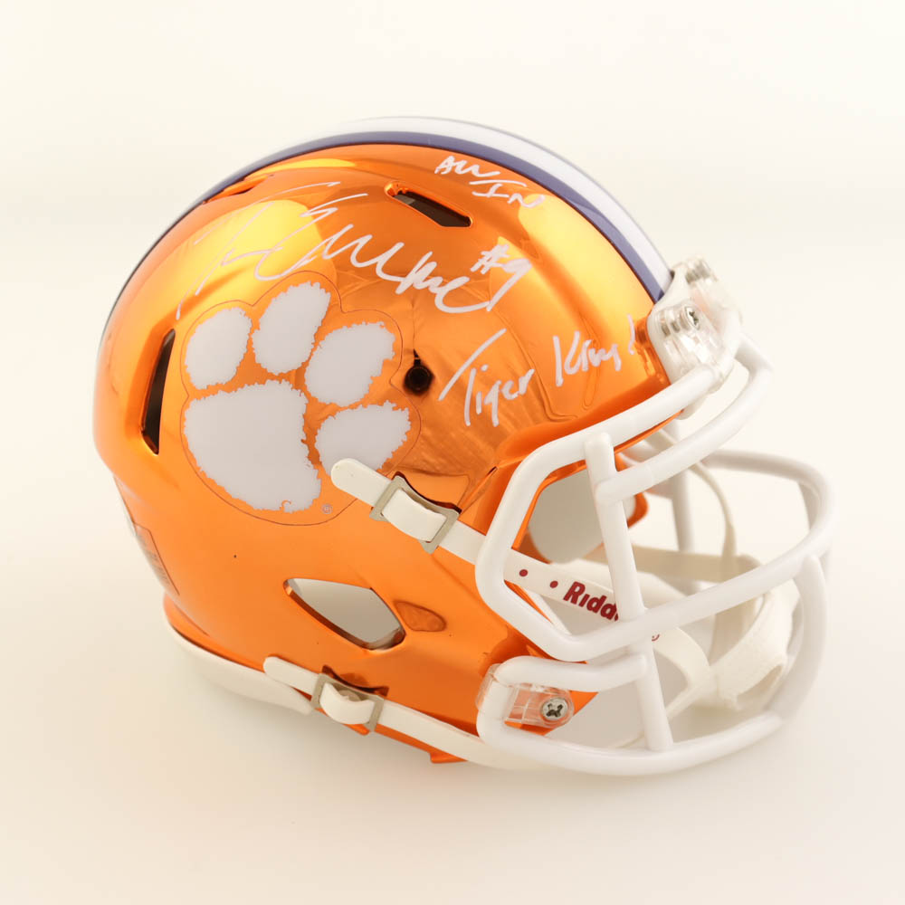 Riddell Clemson Tigers chrome alternate speed mini helmet. Hand-signed and inscribed by Travis Etienne.