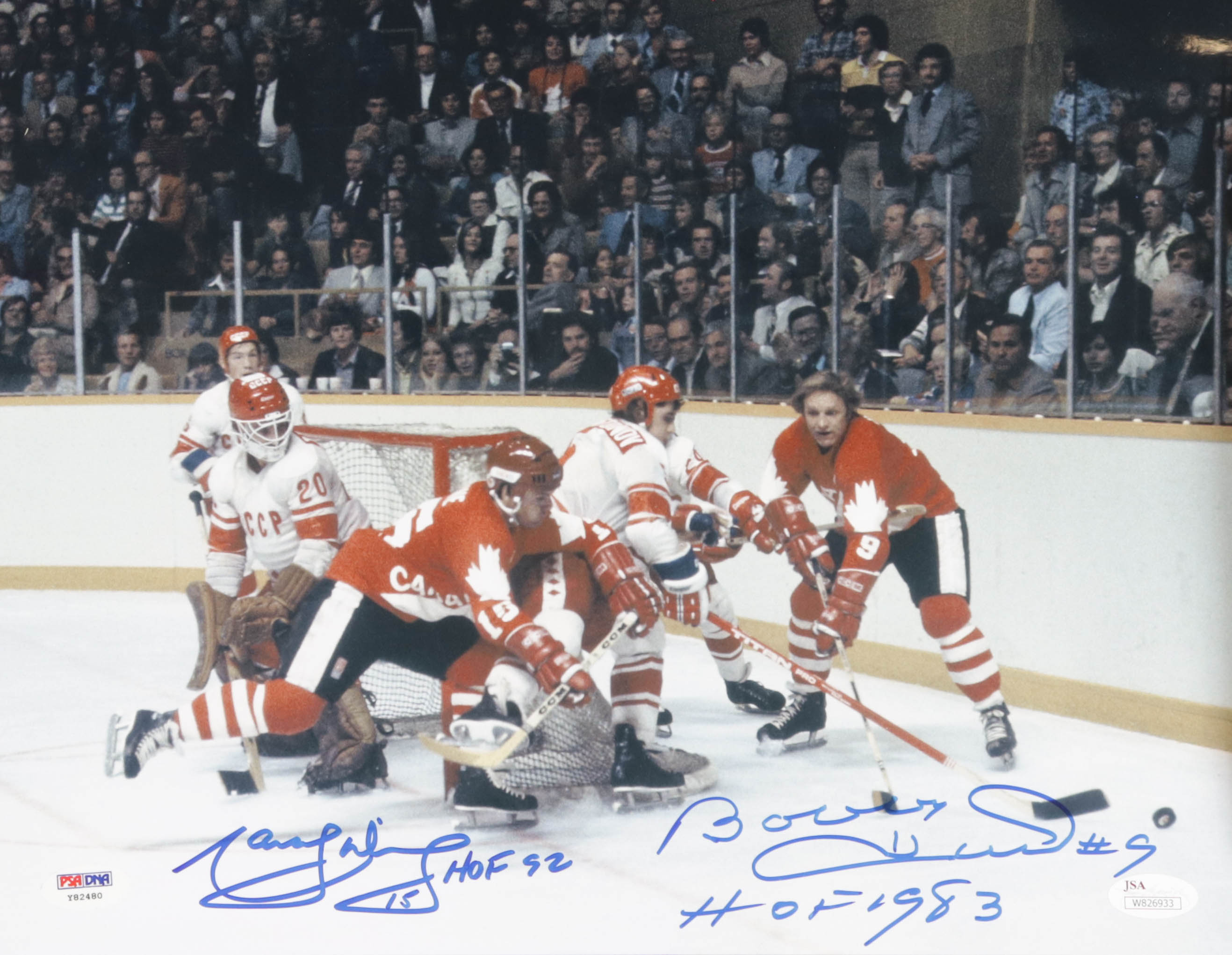 Bobby Hull & Marcel Dionne Signed Team Canada 11x14 Photo Inscribed "HOF 1983" & "HOF 92" (JSA & PSA)