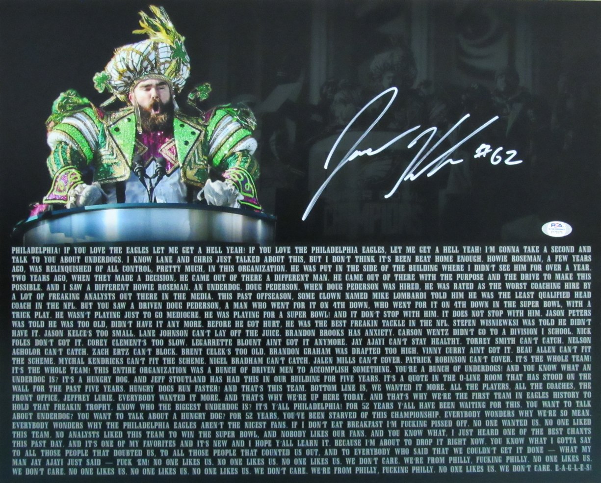Photo measures 16" x 20" in size and has been hand-signed by Jason Kelce (Philadelphia Eagles).