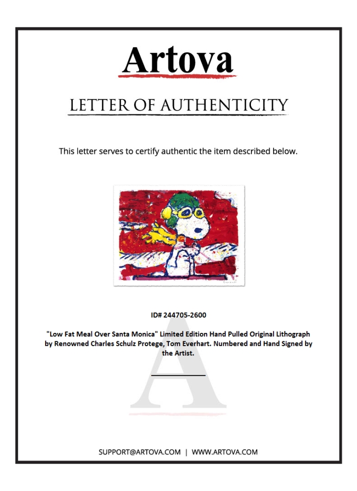 "Low Fat Meal Over Santa Monica" is a limited edition hand pulled original lithograph on museum quality deckle-edge paper, numbered and hand-signed by Tom Everhart. This is one of the final Everhart editions to be created on a rare, antique Marinoni Voirin lithograph press that dates back to the 1800's. Includes Certificate of Authenticity. Measures approx. 37" x 28.5" (with border), 33" x 24" (image).