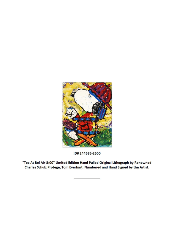 "Tea At Bel Air-3:00" is a limited edition hand pulled original lithograph on museum quality deckle-edge paper, numbered and hand-signed by Tom Everhart. This is one of the final Everhart editions to be created on a rare, antique Marinoni Voirin lithograph press that dates back to the 1800's. Includes Certificate of Authenticity. Measures approx. 22.5" x 30" (no border).
