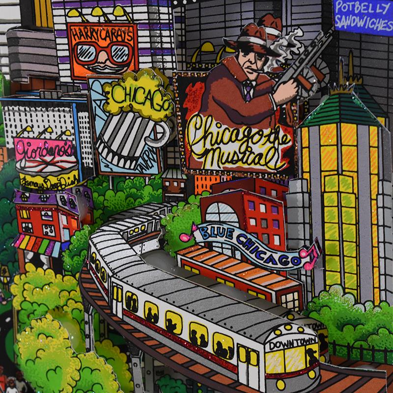 "A Deep Dish Pie in Chi Town (Black)" is a 3D limited edition silk screen construct on paper by Charles Fazzino, numbered and hand-signed by the artist. This piece comes custom framed. Includes Certificate of Authenticity. Measures approximately 13" x 37".