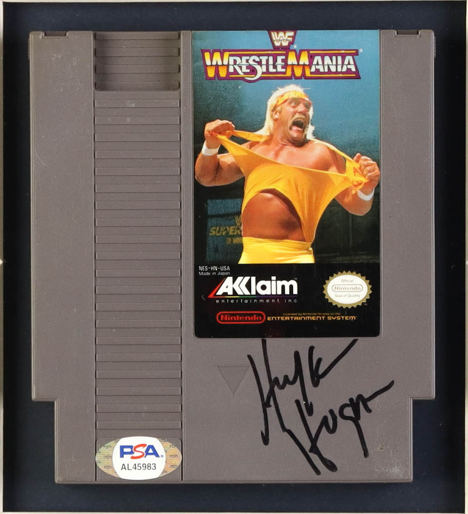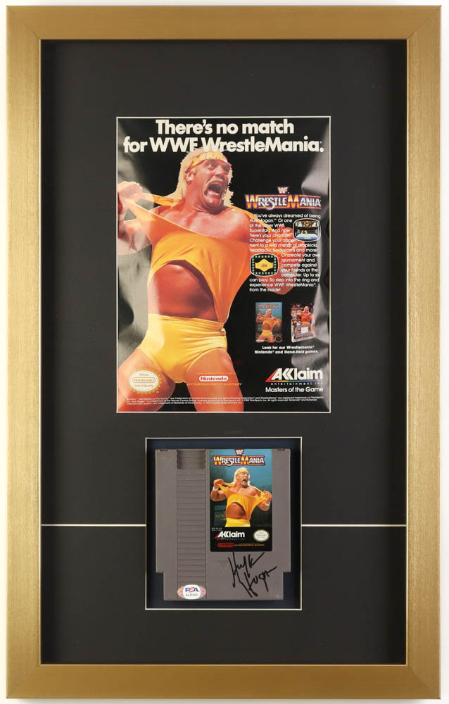 Hulk Hogan Signed 1989 "WWF WrestleMania" Vintage Original Nintendo Video Game Cartridge With Original Nintendo 1980s Promotion Poster Custom Shadowbox Framed Display (PSA)