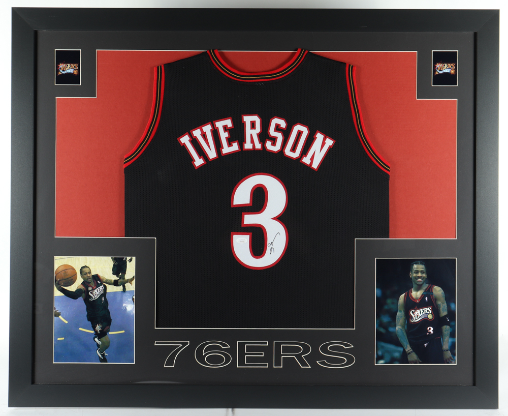 Custom frame measures 35" x 43" in size and features a jersey that has been hand-signed by Allen Iverson (HOF). Please note that the 8" x 10" photos may be in different order.