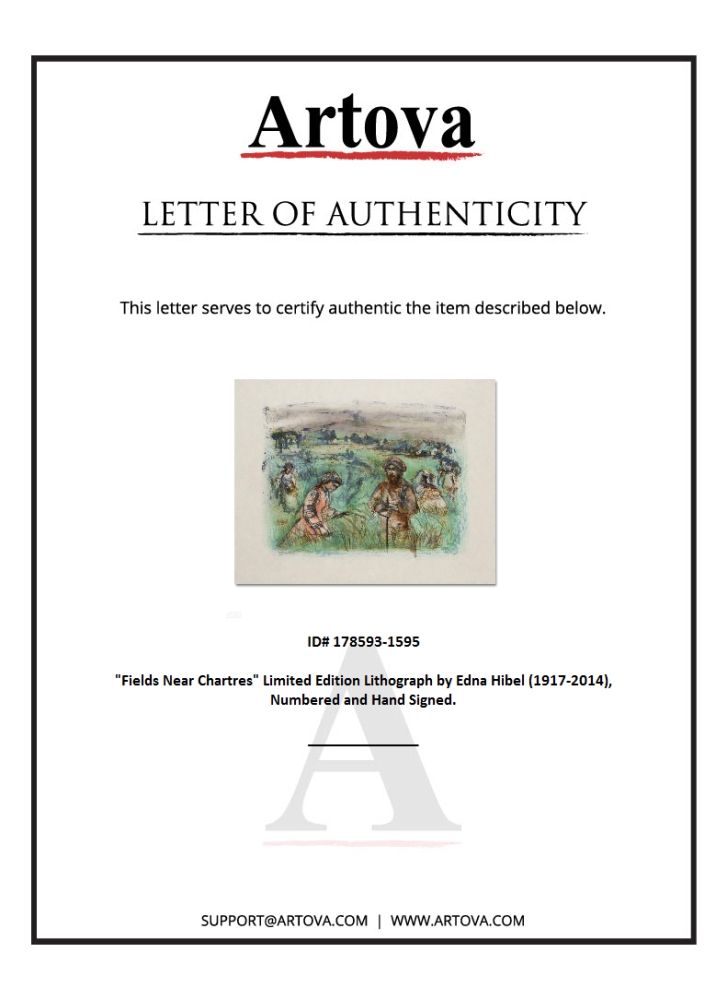 "Fields Near Chartres" is a limited edition lithograph on paper, numbered and hand-signed by Edna Hibel (1917-2014). Measures approximately 30" x 22" (with border), 21" x 15" (image).
