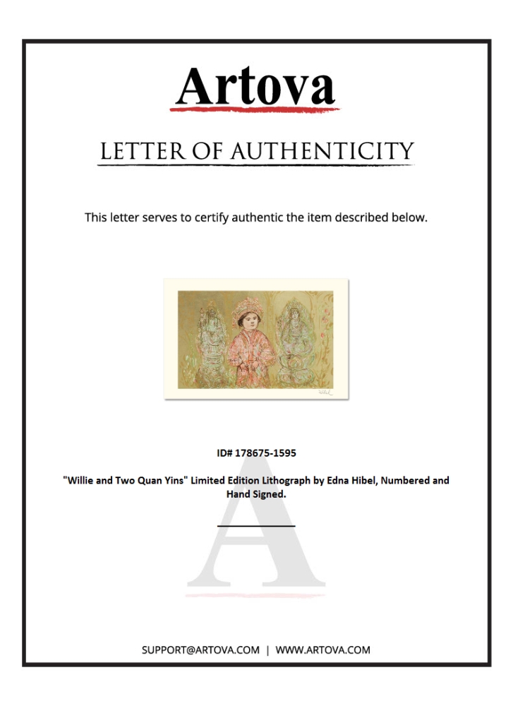 Wild lines and muted colors make Edna Hibel's art stand out in any room. "Willie and Two Quan Yins" is a limited edition lithograph on paper, numbered and hand-signed by Hibel. Includes Certificate of Authenticity! Measures approx. 21.5" x 13" (with border), 16" x 10" (image).