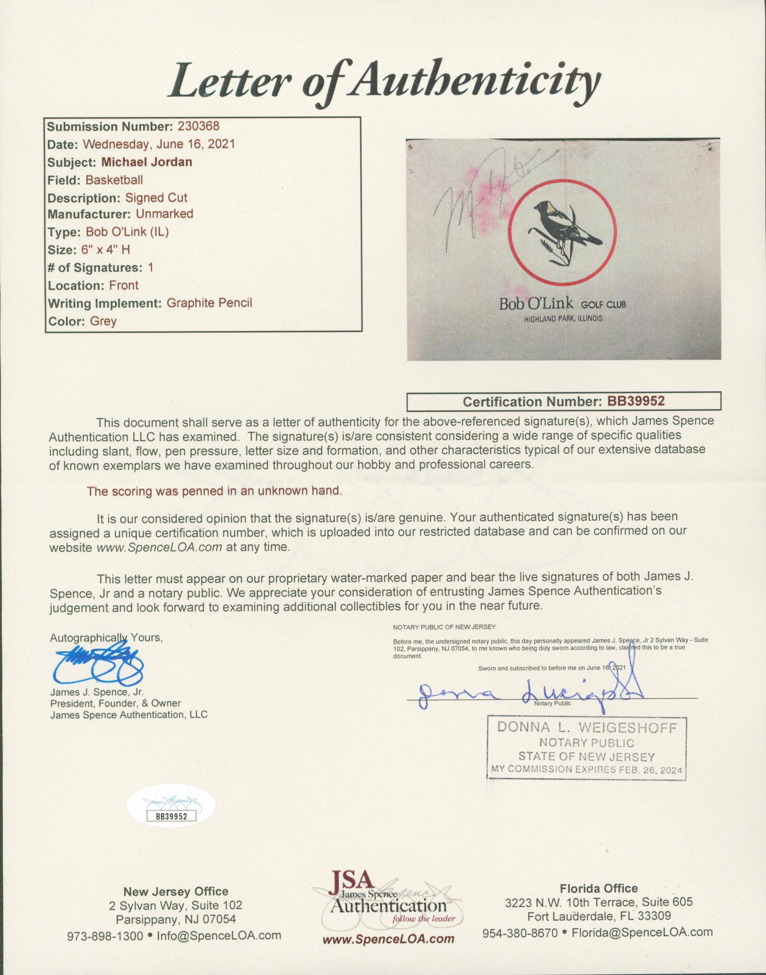 Bob O'Link Golf Club Score Card has been hand signed by Michael Jordan (HOF, Chicago Bulls).