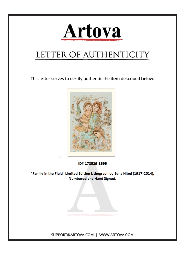 "Family in the Field" is a limited edition lithograph on paper, numbered and hand-signed by Edna Hibel (1917-2014). Includes Certificate of Authenticity! Measures approx. 25" x 36" (with border), 22.5" x 32" (image).
