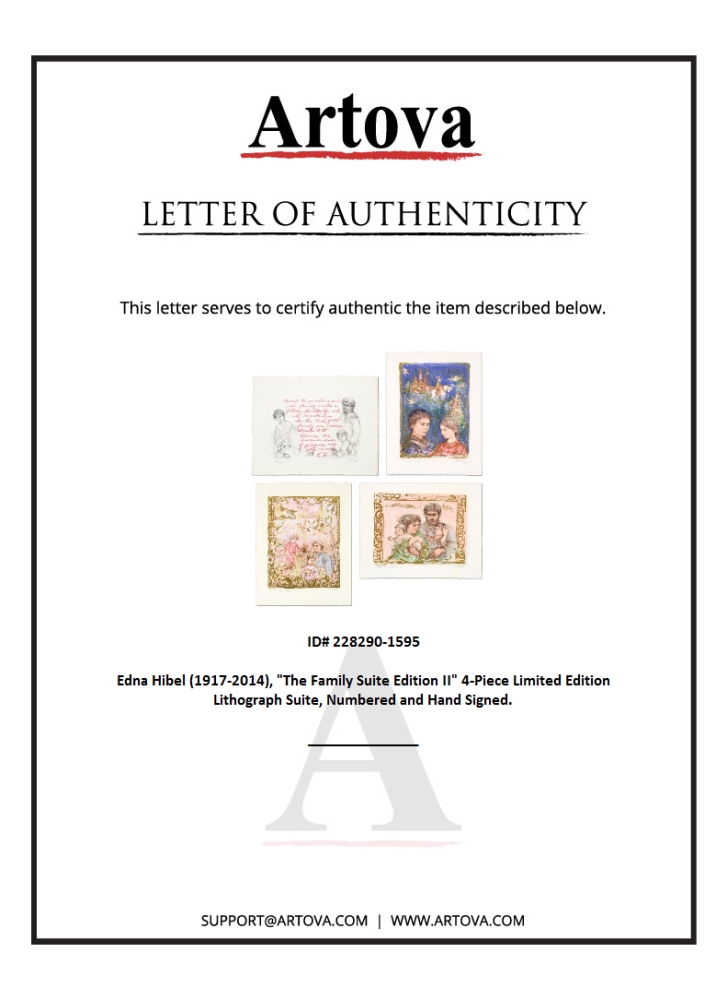 "The Family Suite Edition II" is a 4-piece set of limited edition lithographs on paper celebrating the beauty of family in all of its four stages: "Sowing - The Promise", "Ripening - The Fulfillment", "Harvesting - The Future", and "Through the Generations". Each piece is numbered and hand-signed by Edna Hibel (1917-2014). Includes Certificate of Authenticity. Measures approx. 14" x 18" (box); 12" x 16" (each lithograph).