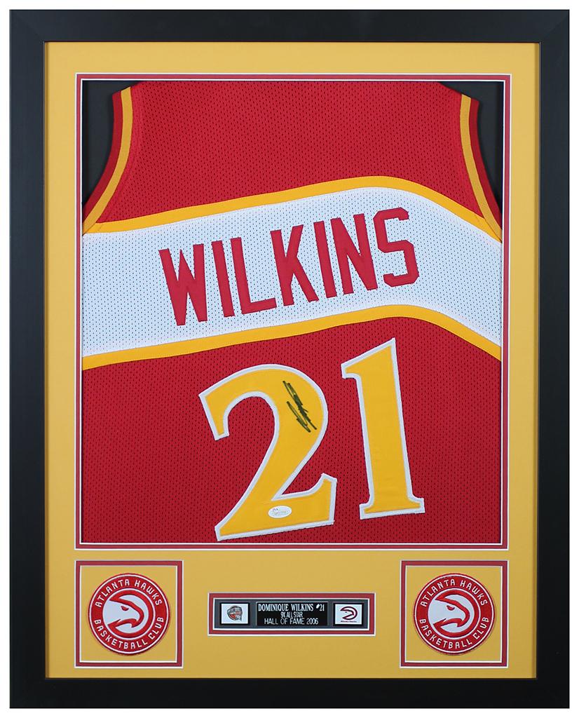 Custom frame measures 24" x 30" in size. Features a jersey that has been hand-signed by Dominique Wilkins (Atlanta Hawks, HOF).