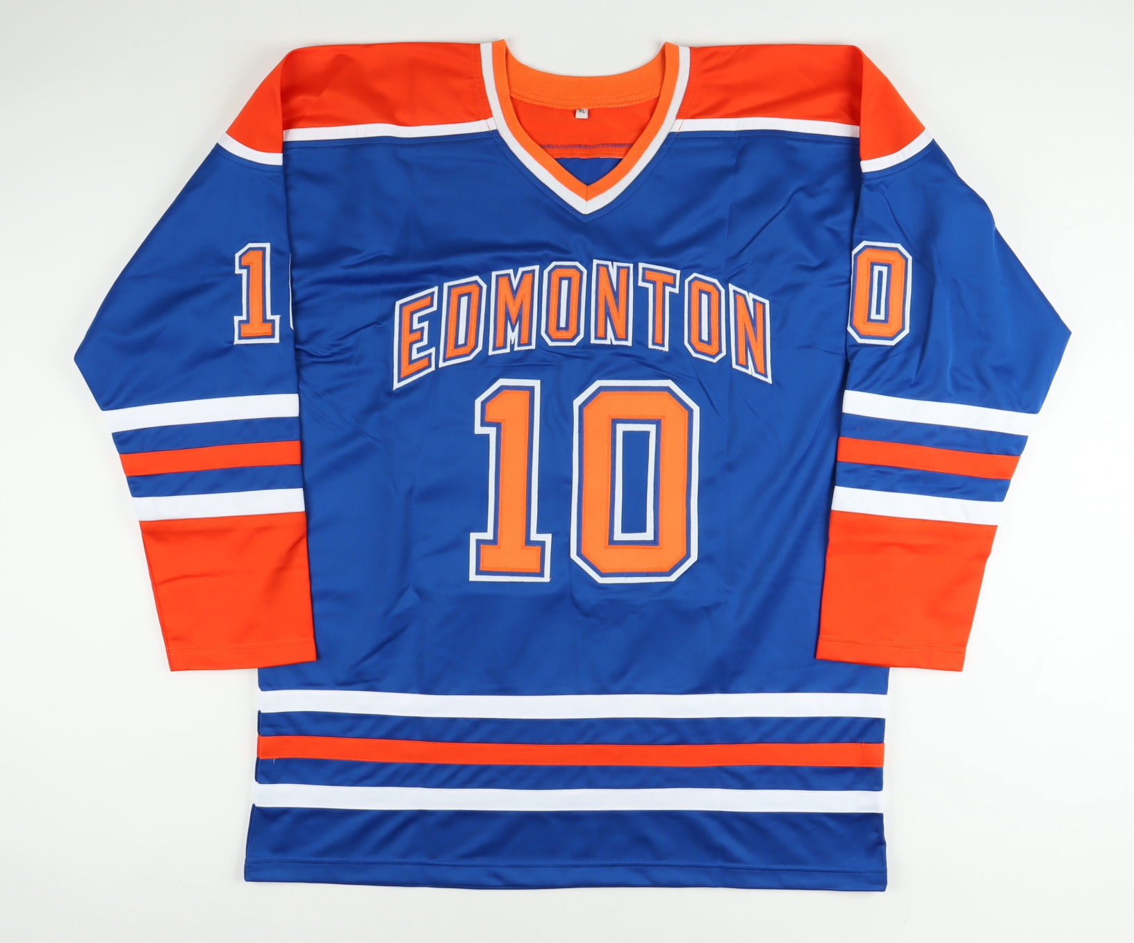 Custom on-ice style jersey. Everything is sewn on, size XL. Hand-signed and inscribed by Esa Tikkanen.