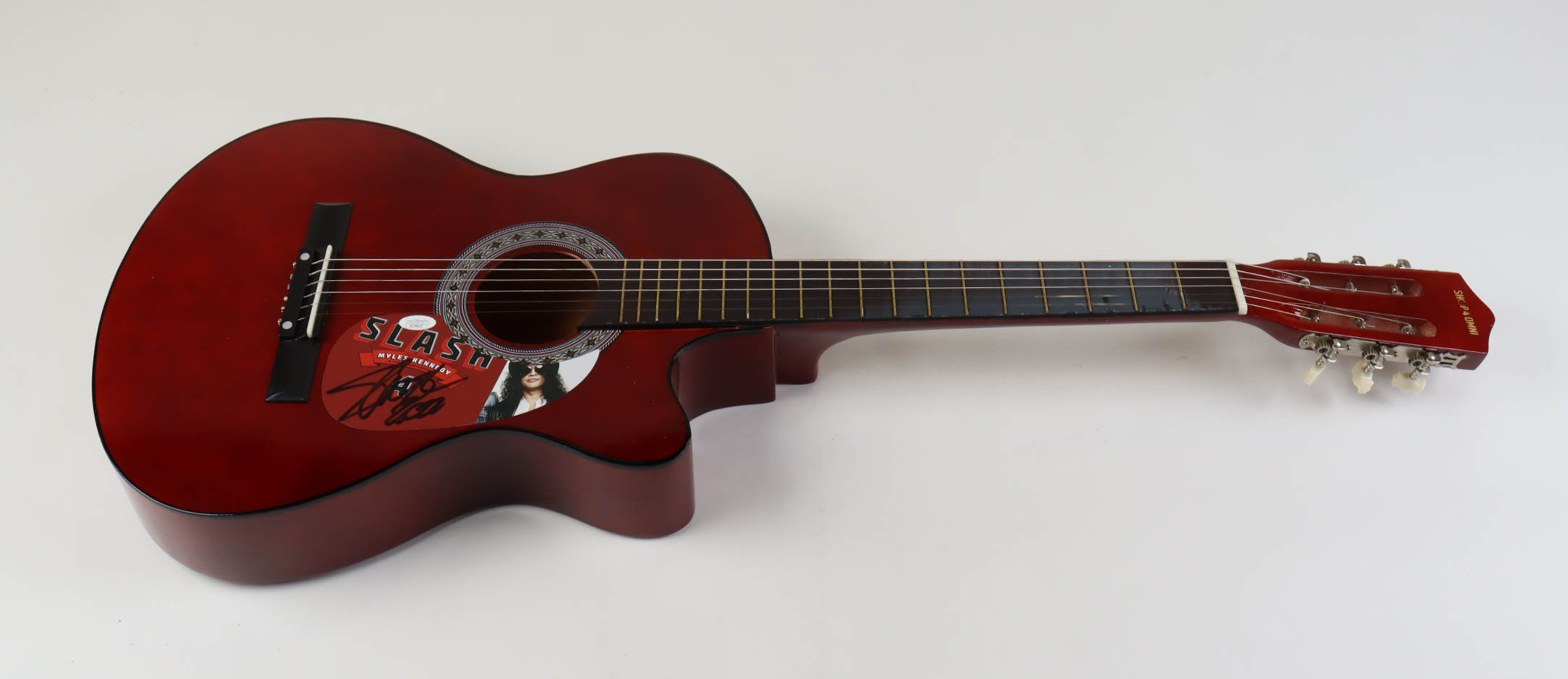 Acoustic Guitar measures approximately 38" in length and has been hand-signed and inscribed on a CD cover that has been repurposed as a pick-guard by Slash.