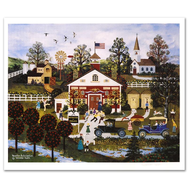 Cozy, down-home images of a bygone era when life was simpler - this is the feeling captured in the creations of one of the world's most recognized artists. "Vacation Anticipation" is a limited edition lithograph on paper, numbered and hand-signed by Wooster Scott. Measures approximately 22" x 19.5" (with border), 20" x 16" (image).
