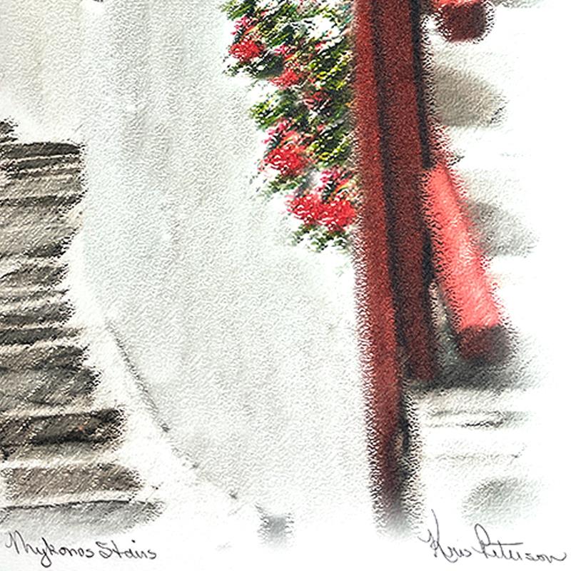 "Mykonos Stairs" is a limited edition giclee on paper by Kris Peterson, numbered and hand-signed by the artist. Includes letter of authenticity. Measures approx. 13" x 19" (image)
