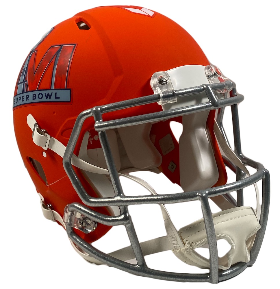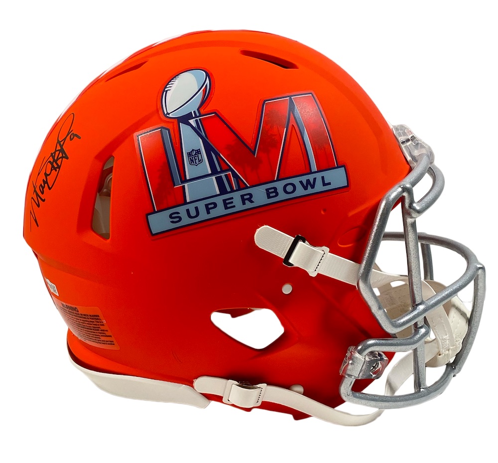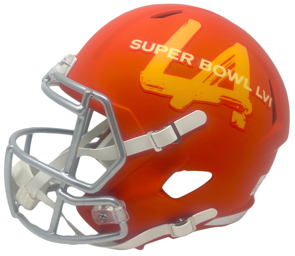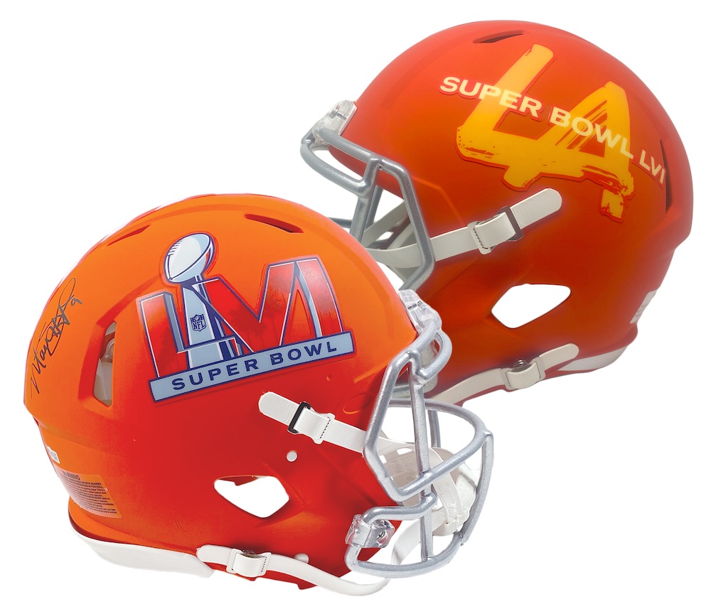 Riddell Super Bowl LVI full-size authentic on-field speed helmet. Has been hand-signed by Matthew Stafford (Los Angeles Rams).