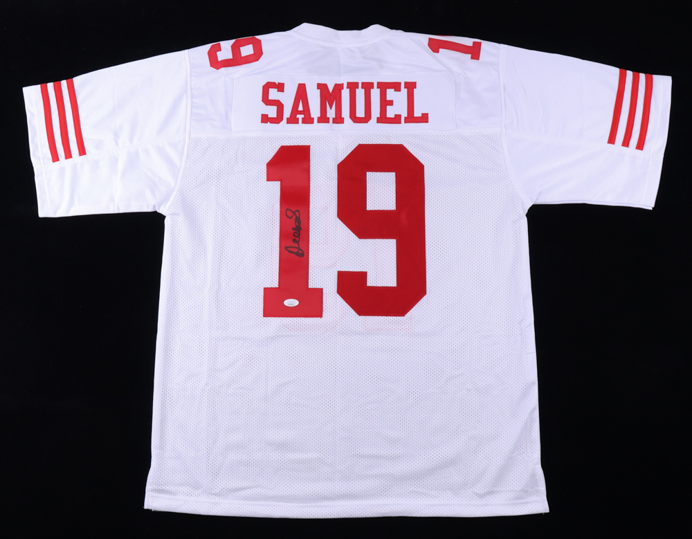 Custom on-field style jersey. Everything sewn on, size XL. Hand-signed by Deebo Samuel.