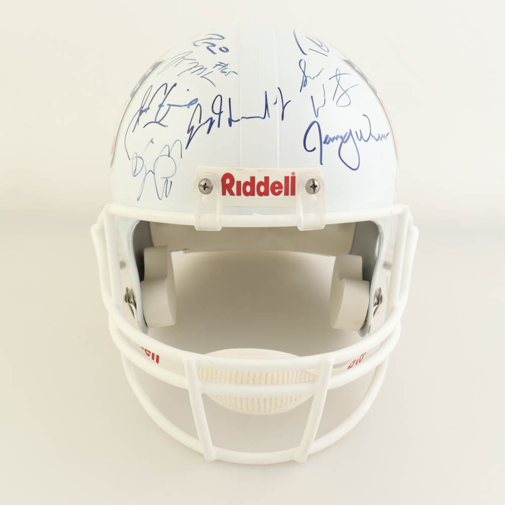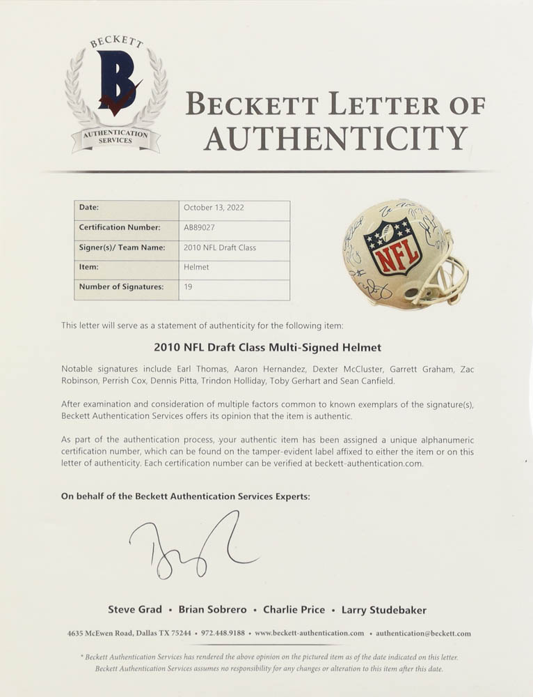 Riddell full-size replica NFL logo helmet. Hand-signed by (19) members of the 2010 NFL Draft. Signers include Earl Thomas (Seattle Seahawks), Aaron Hernandez (D.2017, New England Patriots), Dexter McCluster (Kansas City Chiefs), Garrett Graham (Houston Texans), Zac Robinson (New England Patriots), Perrish Cox (Denver Broncos), Dennis Pitta (Baltimore Ravens), Trindon Holliday (Houston Texans), Toby Gerhart (Minnesota Vikings), Sean Canfield (New Orleans Saints), and (9) others. Please note, a few of the signatures are smudged or faded.