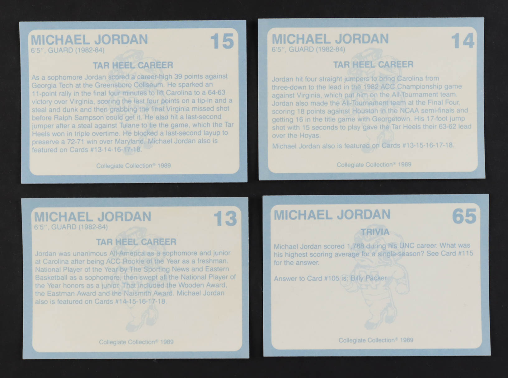 1989-90 North Carolina Collegiate Collection Basketball Complete Set of (200) Cards with Michael Jordan #65, Michael Jordan #13, Michael Jordan #14, Michael Jordan #15