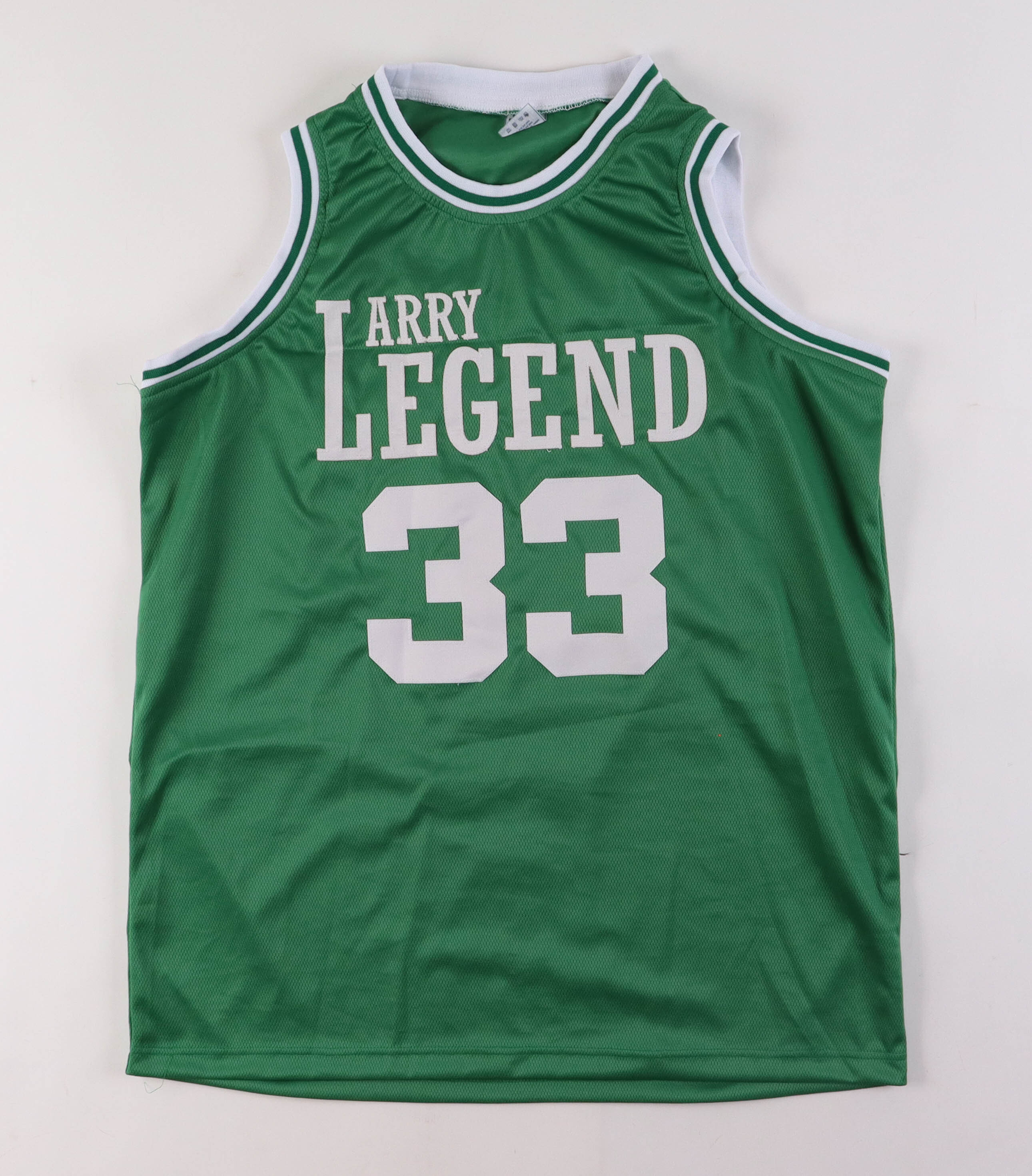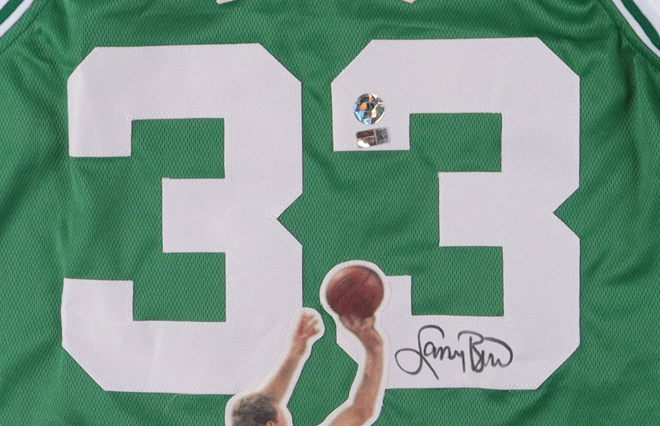 Custom on-court style jersey. Everything is printed and sewn on, size XL. Hand-signed by Larry Bird (HOF).