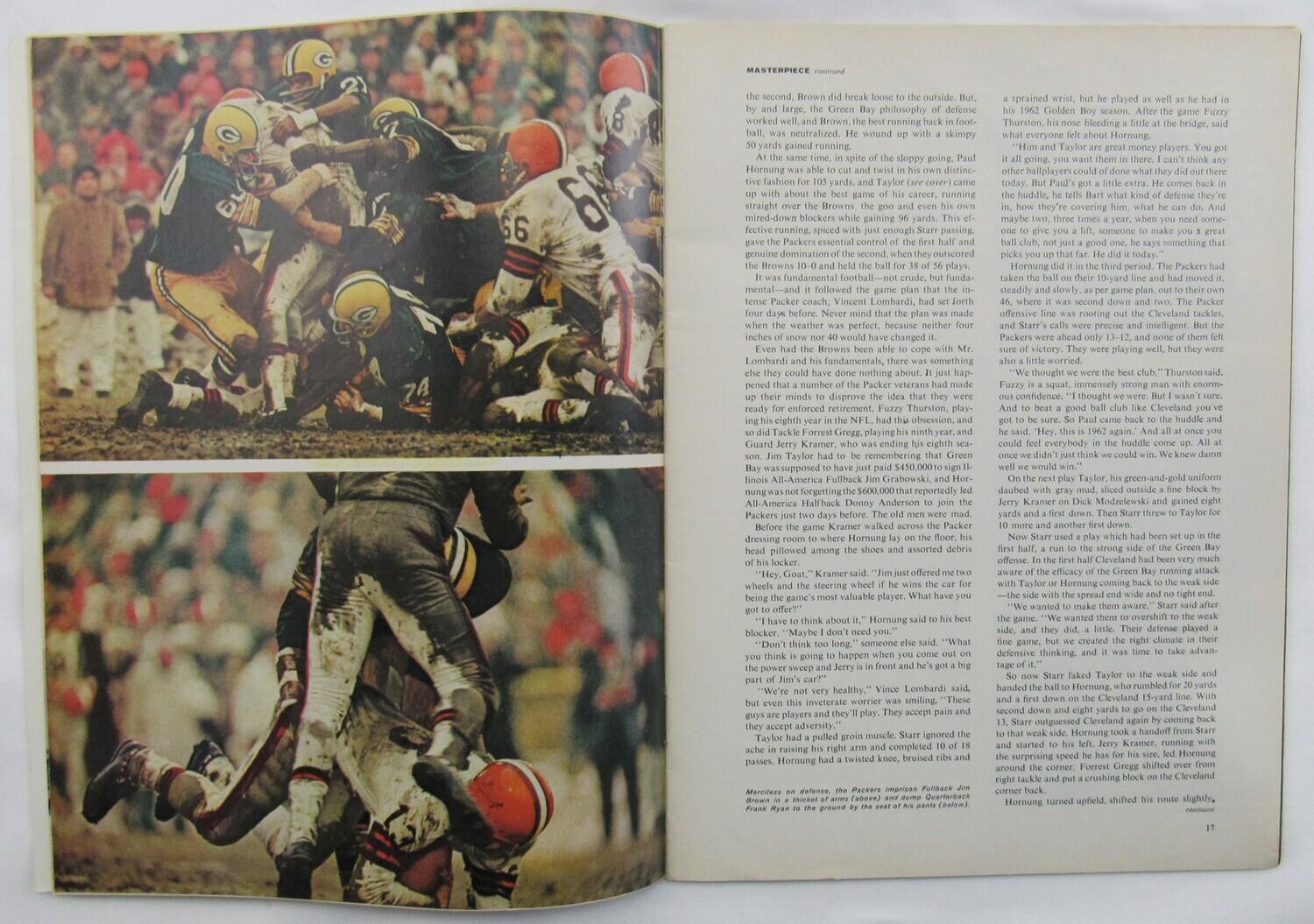 January 10th, 1966 edition of Sports Illustrated magazine cover has been hand-signed by Jim Taylor (D.2018, Green Bay Packers, HOF). Also included is a complete unsigned edition of this magazine. Please note, the magazine shows signs of natural aging and the corners are creased and torn.