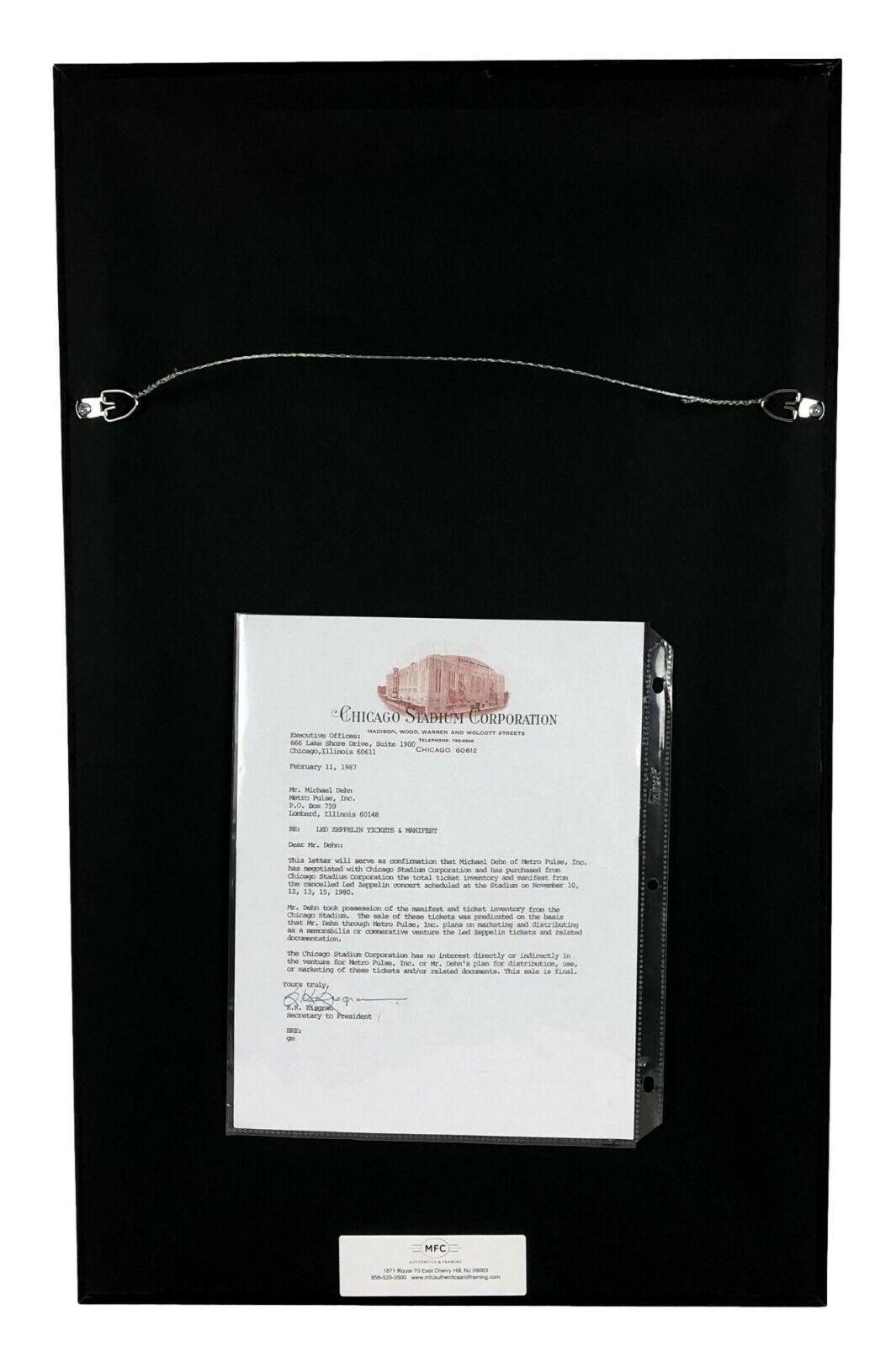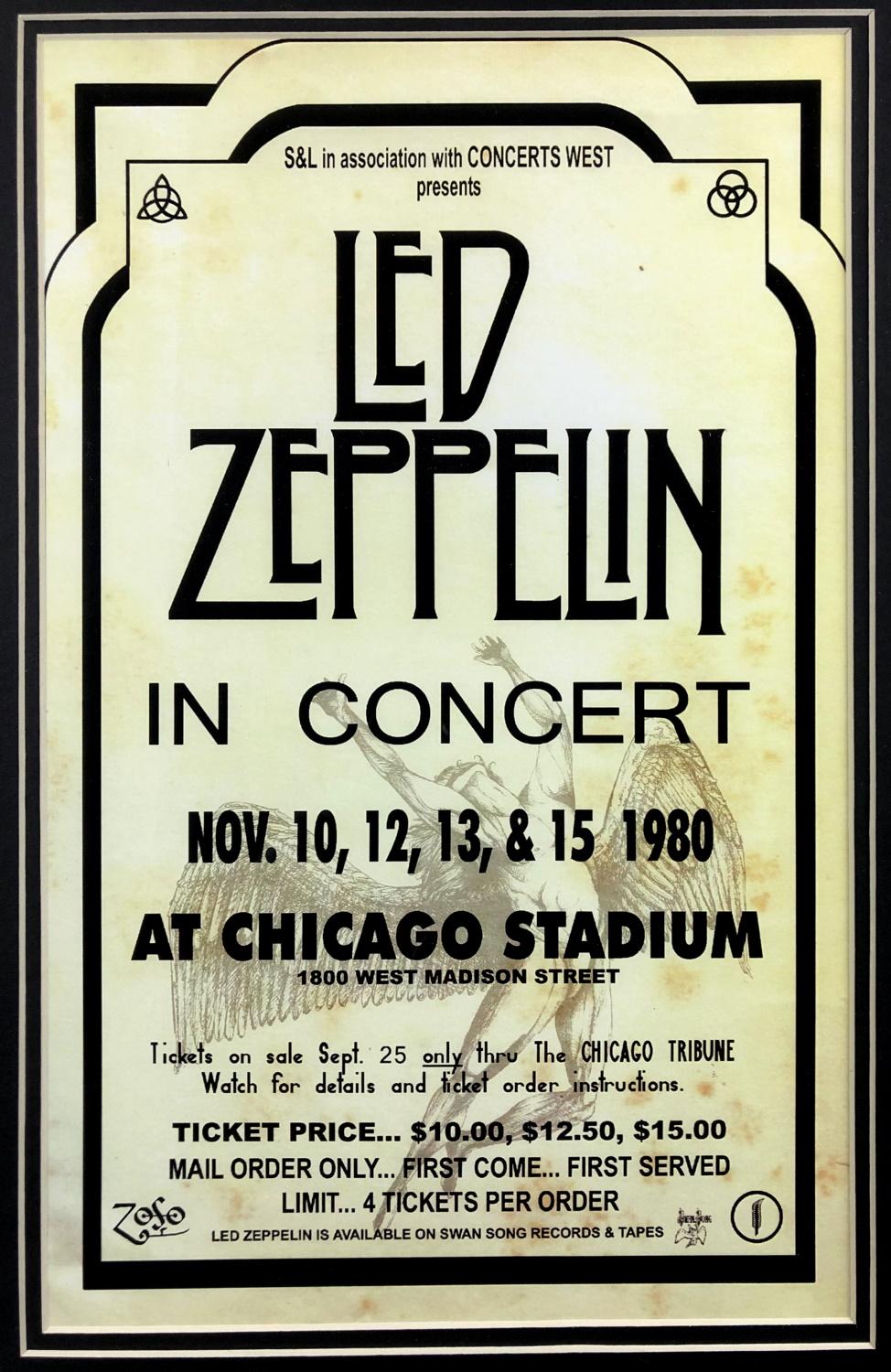 Display measures approximately 16" x 23" in size. Features a poster and a Chicago Stadium Led Zeppelin concert ticket dated November 12th, 1980. The frame is double matted and ready for display.