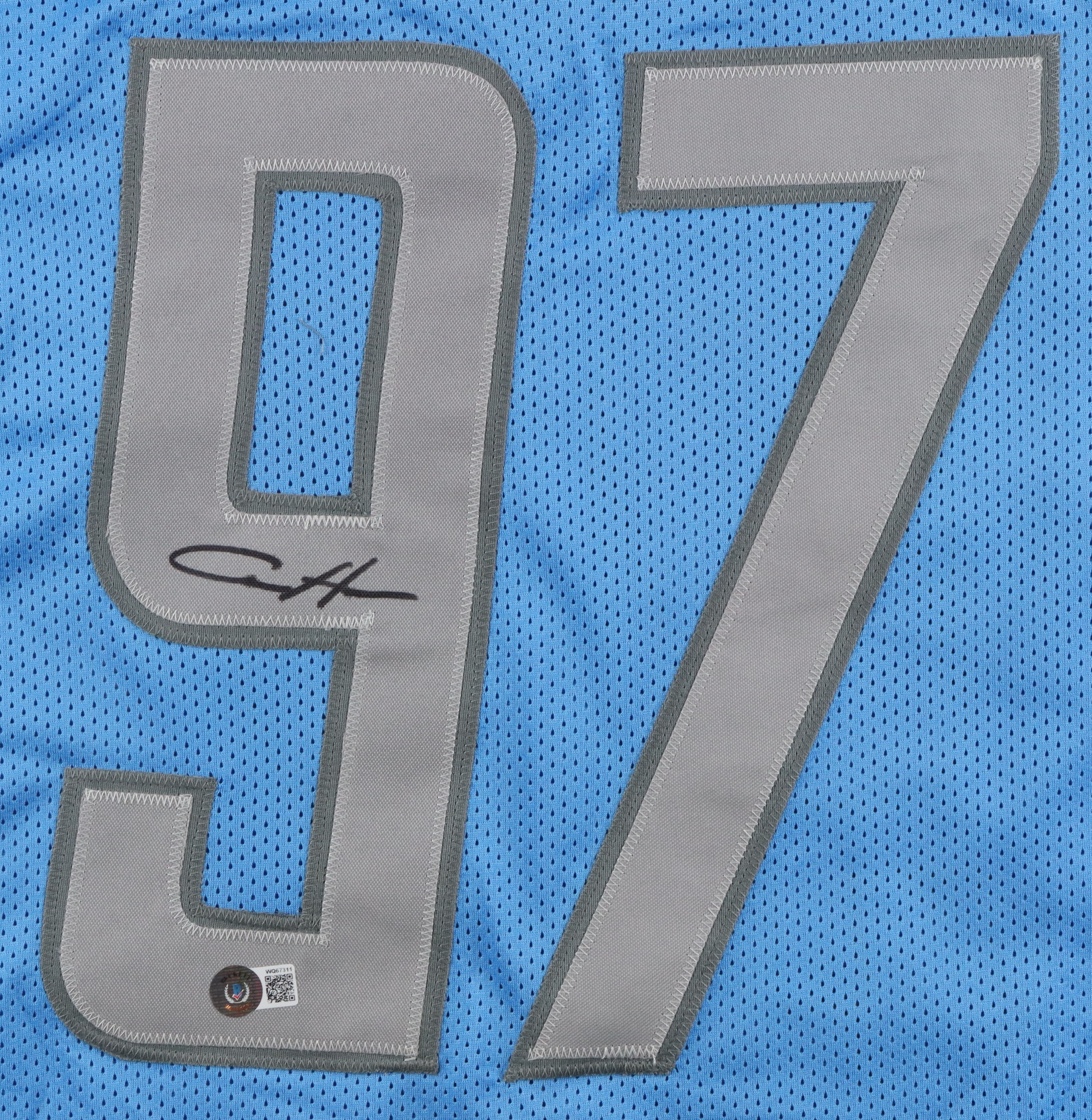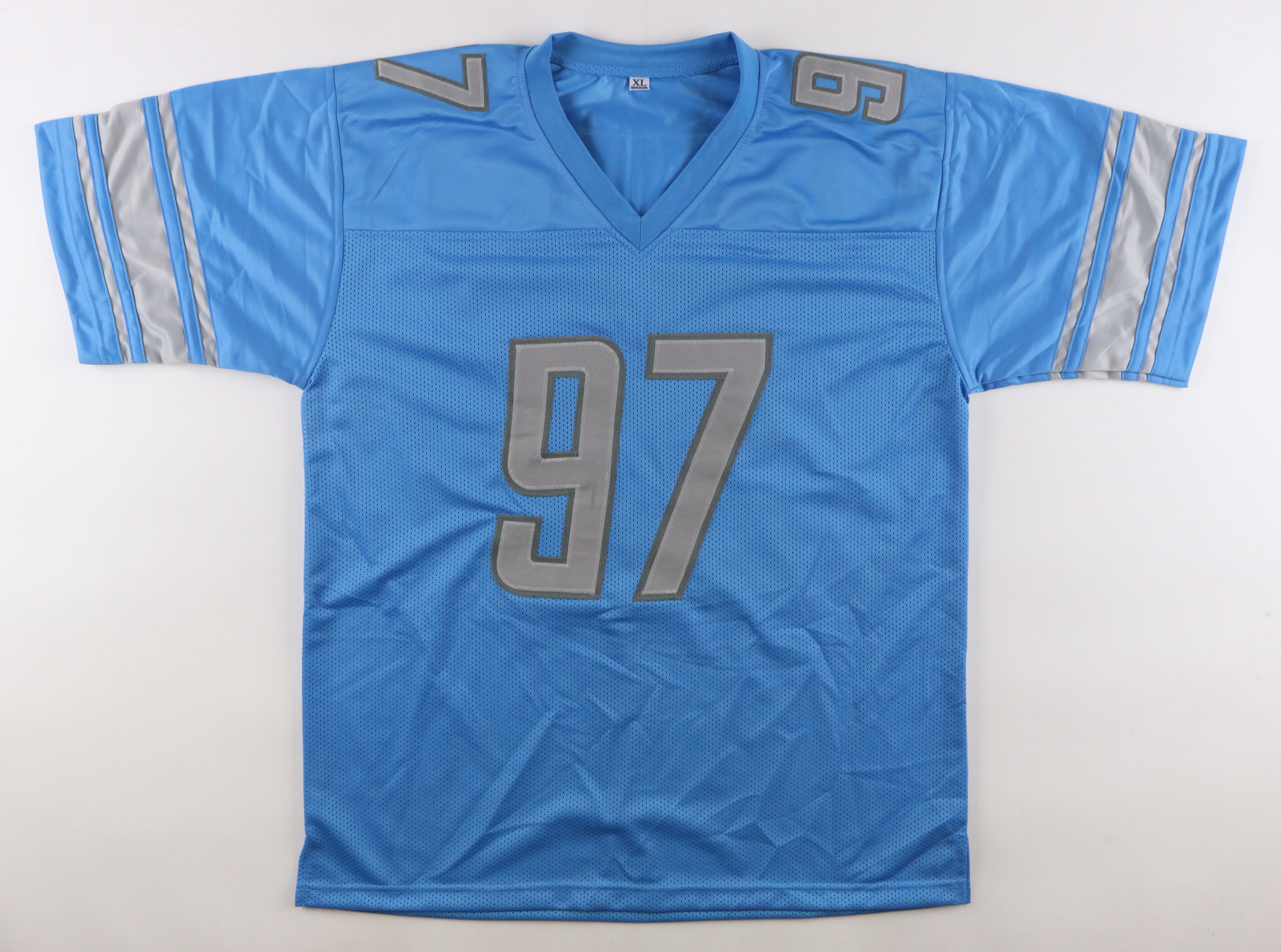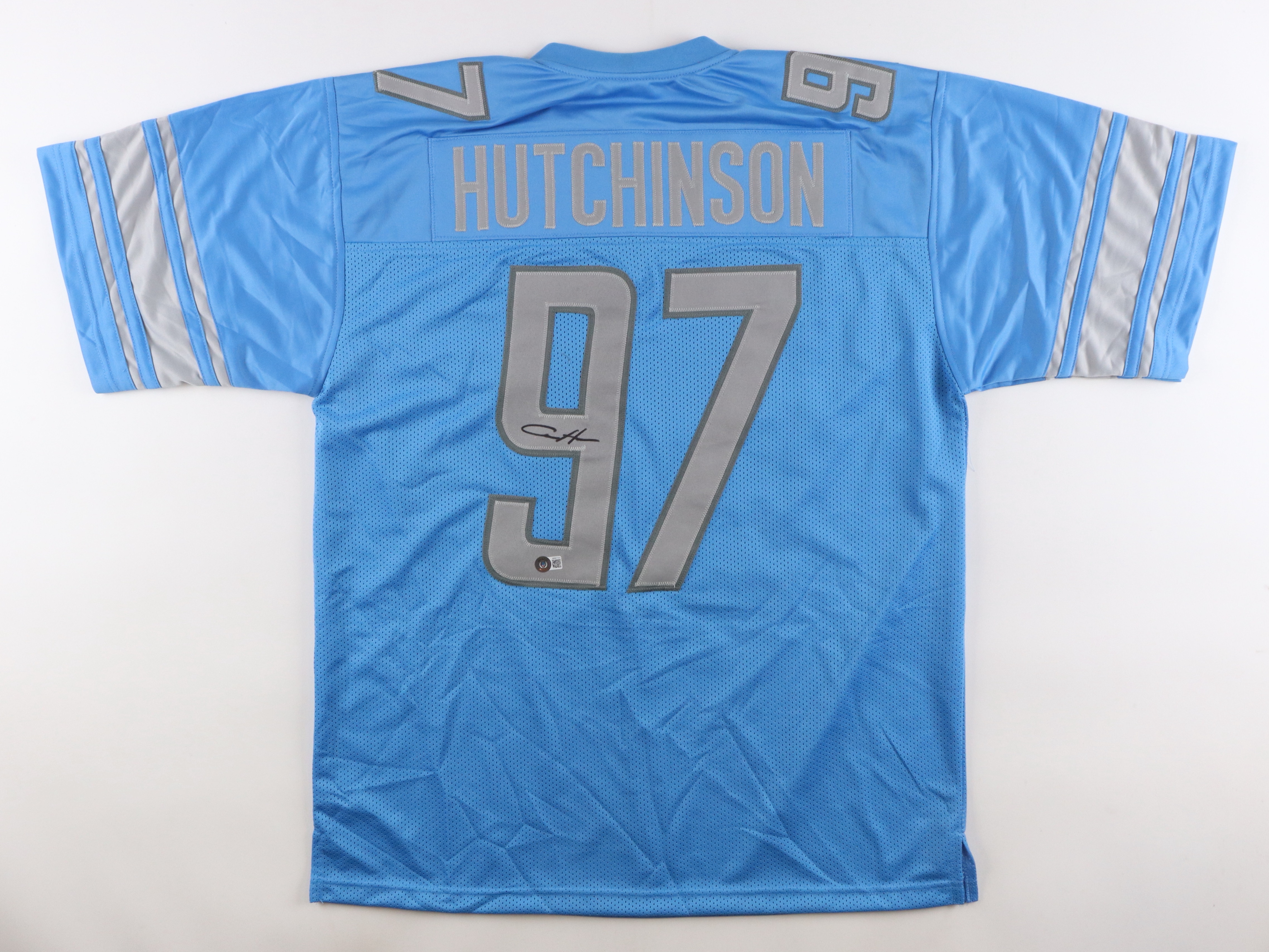 Custom on-field style jersey. Everything is sewn on, size XL. Hand-signed by Aidan Hutchinson.