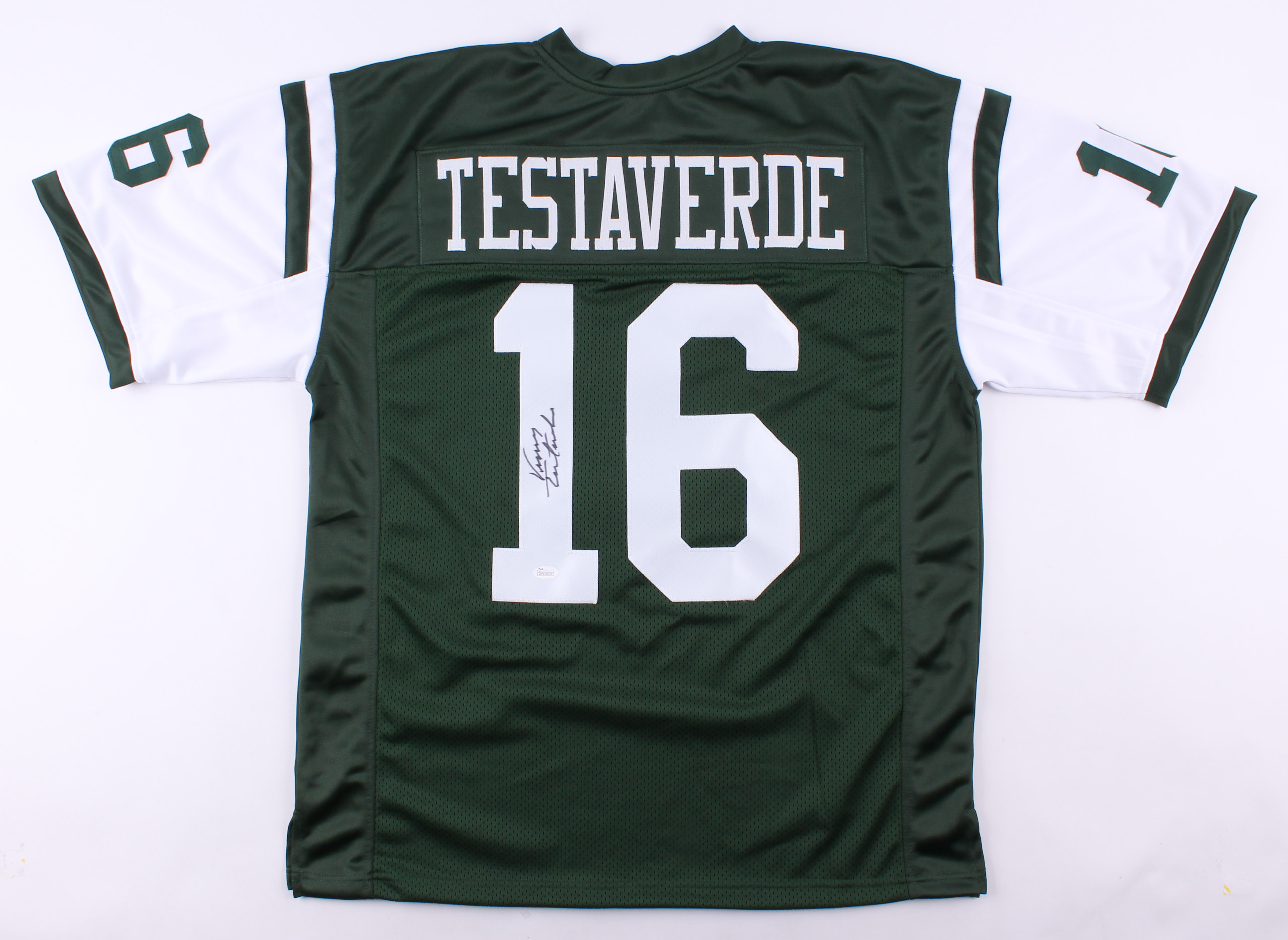 Custom on-field style jersey. Everything is sewn on, size XL. Hand signed in black felt-tip pen by Vinny Testaverde.
