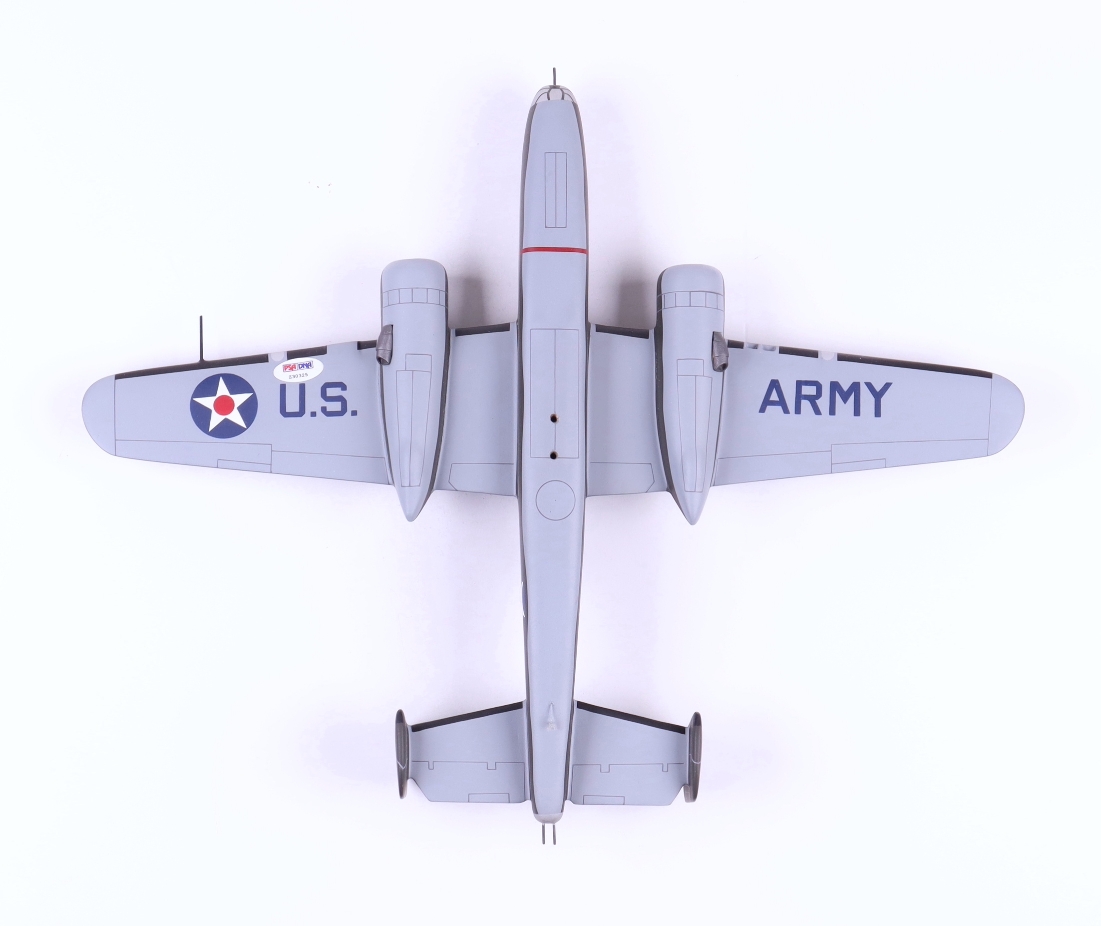 WWII B-25 'Doolittle' Bomber Model Airplane measures approximately 15" x 18" in length and width and has been hand-signed by Richard E. Cole (D. 2019). Please note that the display stand is included in the listing as shown in the photos.