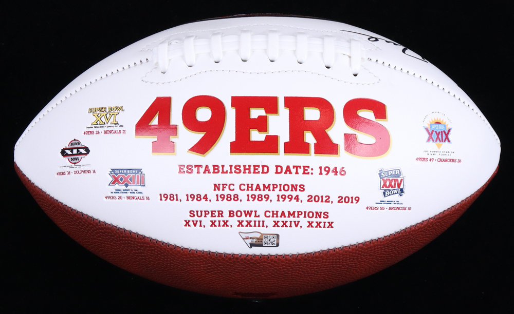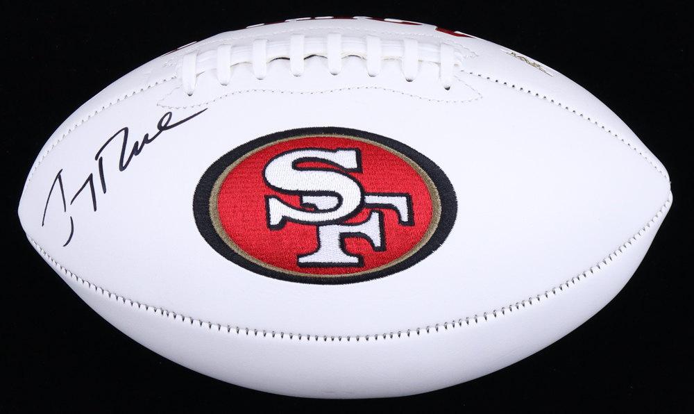 San Francisco 49ers logo football has been hand-signed by Jerry Rice (HOF).