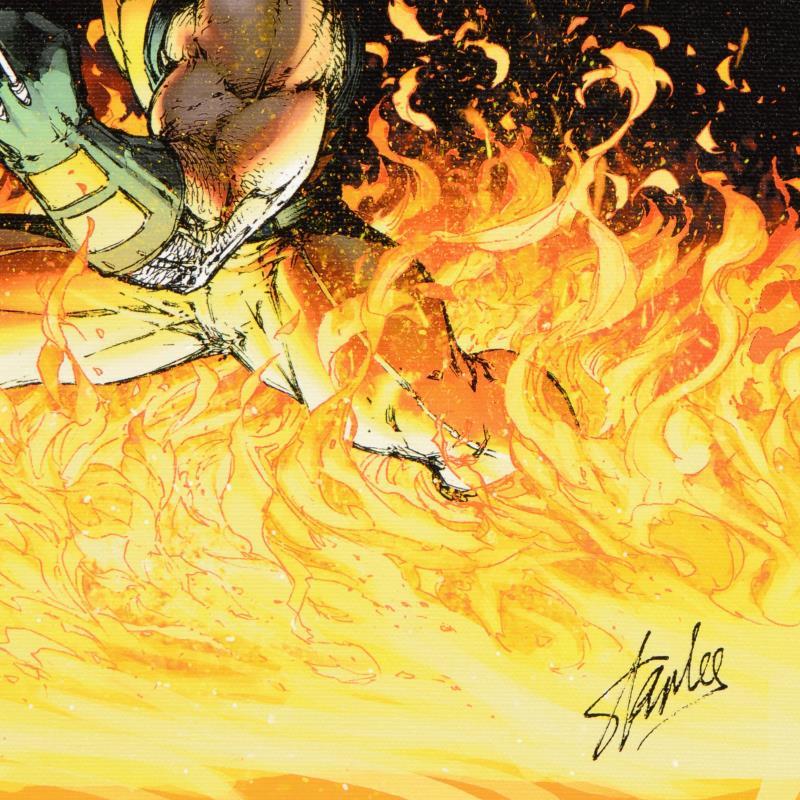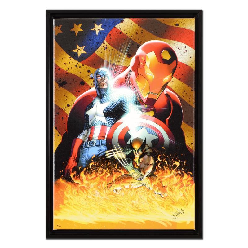 A piece of comic book history, this limited edition print, drawn by Michael Turner (1971-2008), depicts popular characters from the Marvel Universe. Michael Turner started his career at Top Cow Productions, where he co-created the popular titles "Witchblade" and "Fathom". Eventually, Turner would contribute cover art to the Marvel titles X-Men, Spider-Man, and the Fantastic Four, among others. His career was cut tragically short when he died of bone cancer in 2008. "Civil War #1" is a limited edition giclee on canvas by Michael Turner presented by Marvel Comics, numbered 5/20 and hand signed by the great Stan Lee (1922-2018). This piece comes framed. Includes Letter of Authenticity. Measure approx. 17" x 24" (frame), 15" x 22" (image).