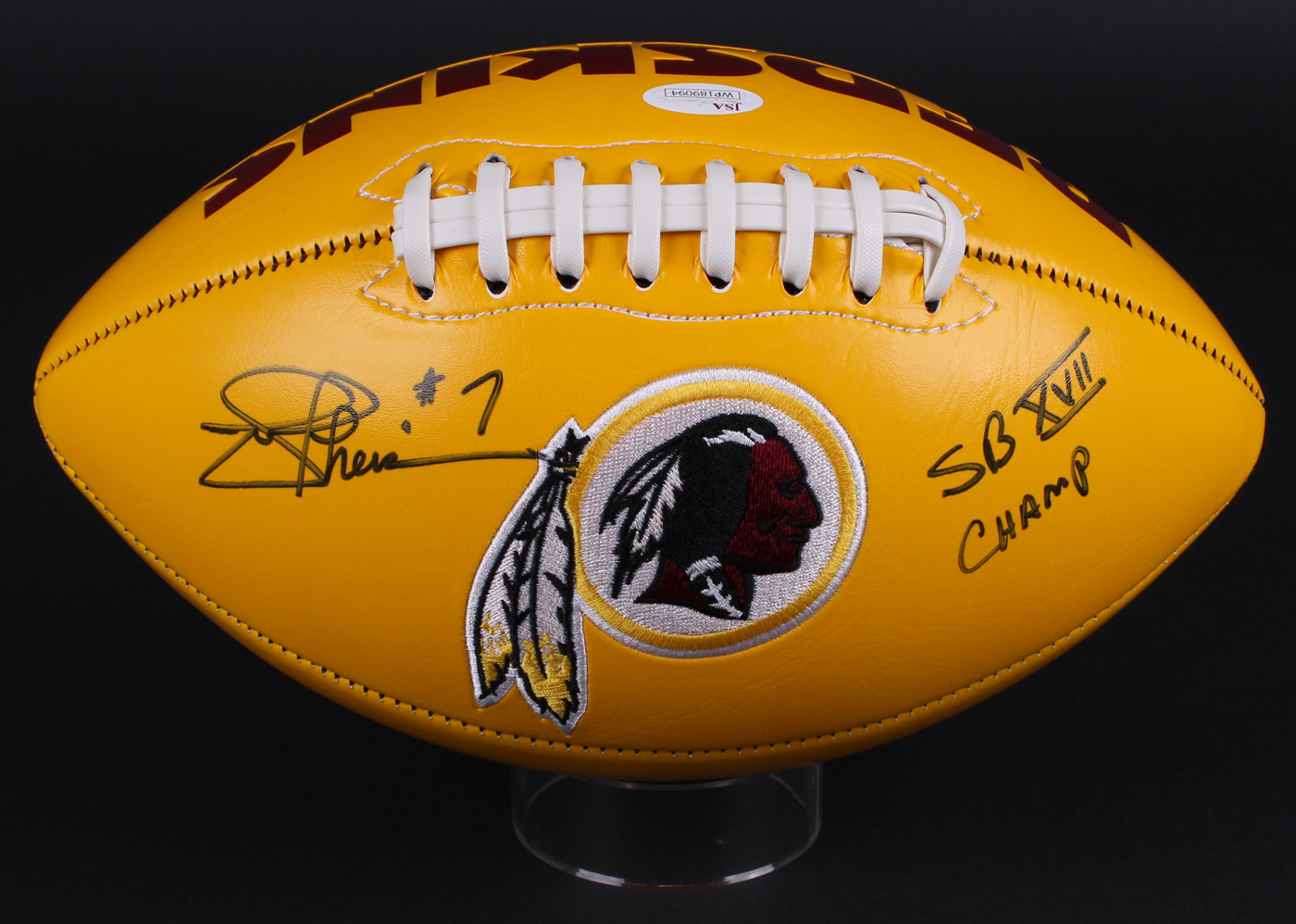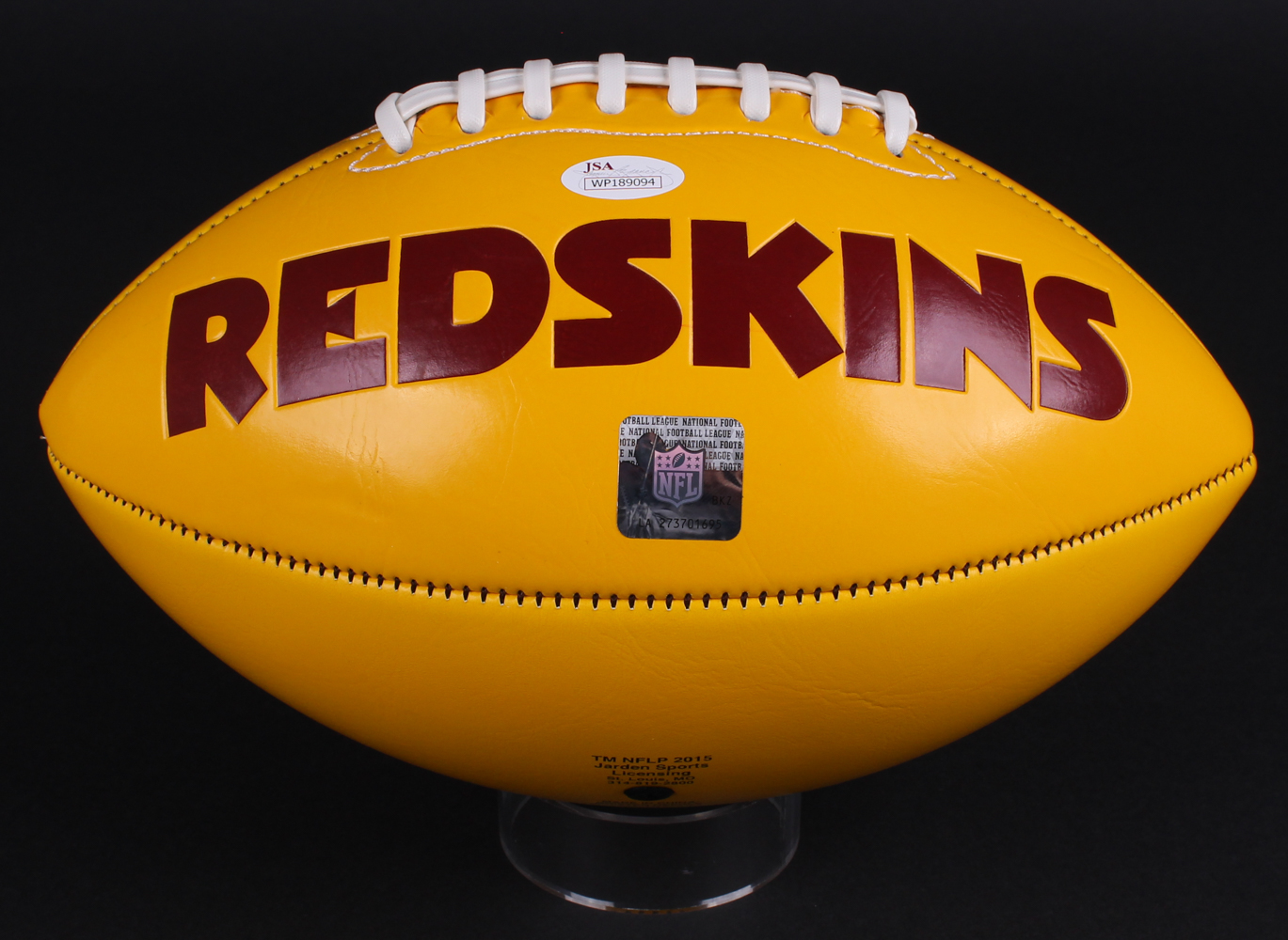 Redskins Logo full-size football. Hand-signed and inscribed in black felt-tip pen by Joe Theismann.