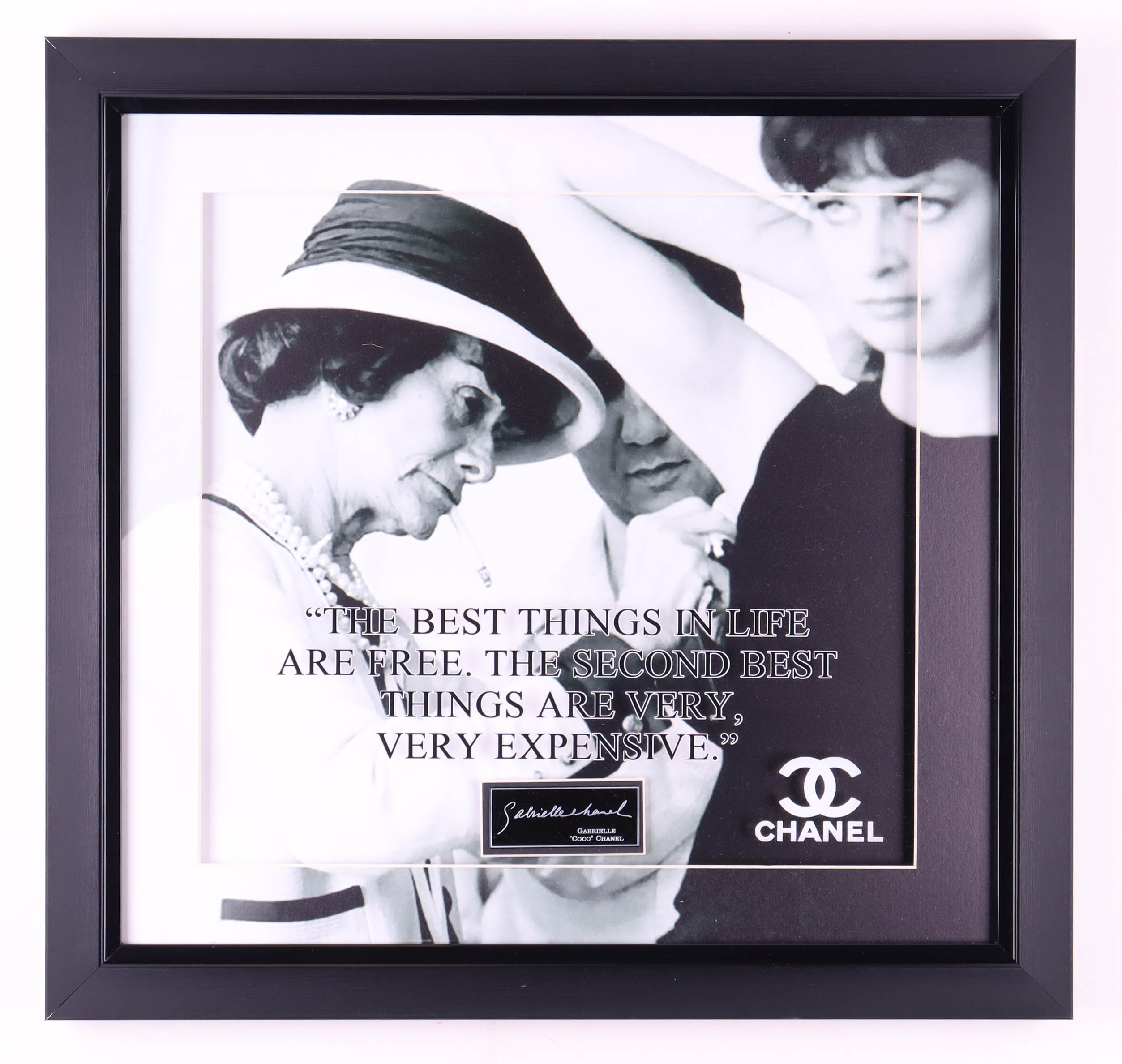 Custom frame measures approximately 22" x 23" in size and features a photo of Gabrielle "Coco" Chanel (D. 1971). Please note, the signature is a facsimile.