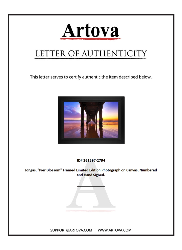 "Pier Blossom" is a limited edition giclee on canvas by photographer Jongas, numbered and hand-signed by the artist. The piece comes custom framed and includes Letter of Authenticity. Measures approximately 28" x 38" (framed); 20" x 30" (image).