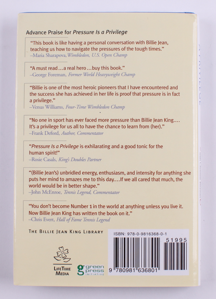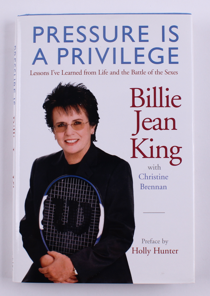"Pressure is A Privilege" hardback book. Hand-signed in black felt-tip pen by Billie Jean King (Tennis).
