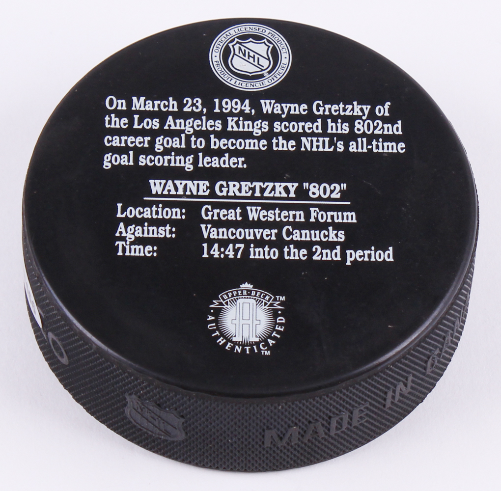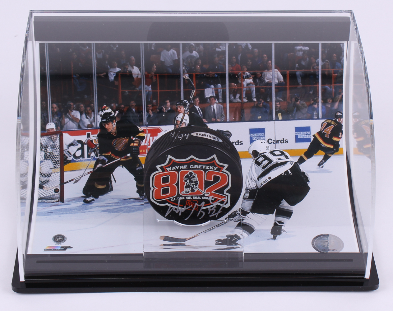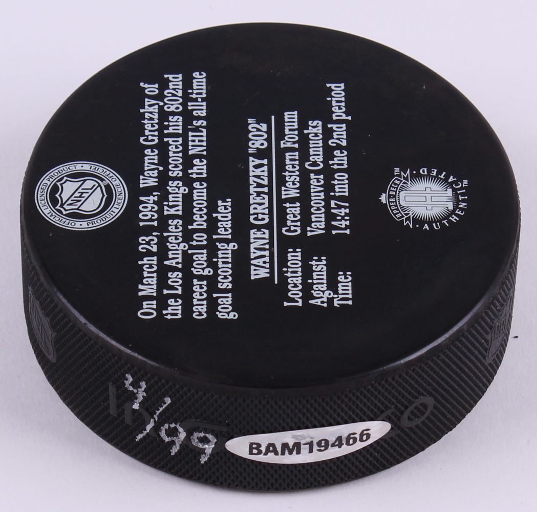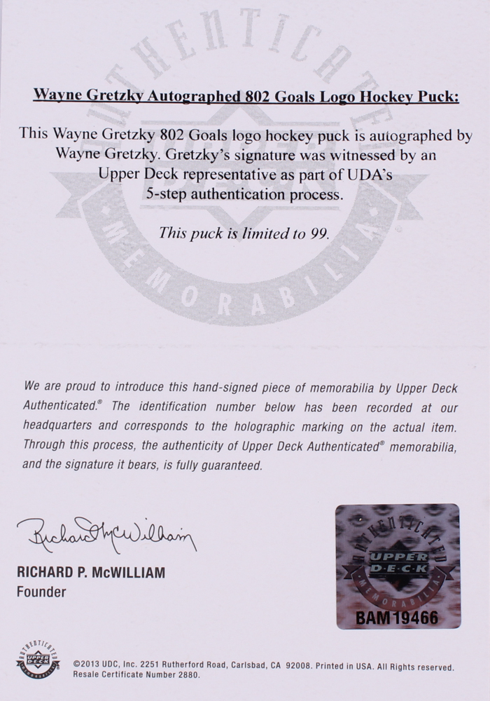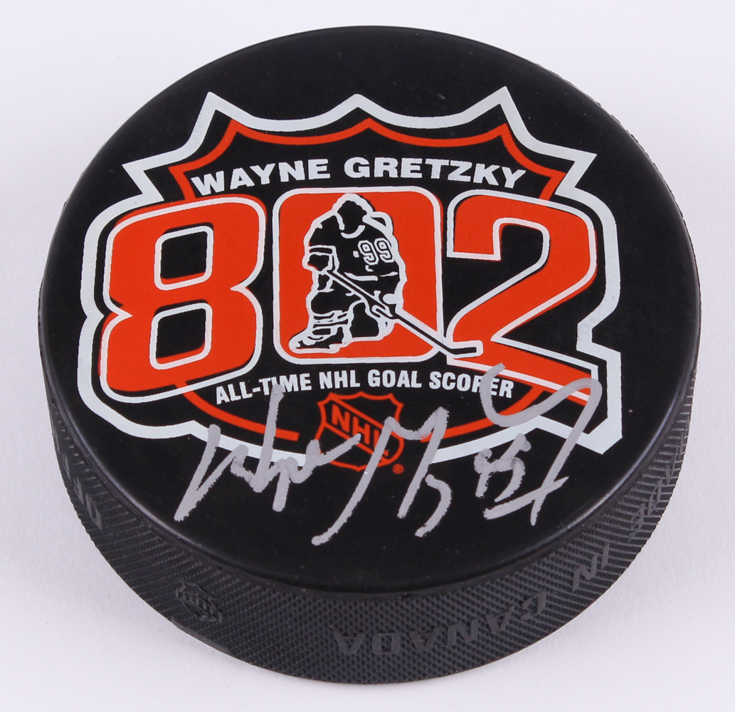 Oilers Logo Hockey Puck has been hand-signed in silver paint pen by Wayne Gretzky (HOF). Puck comes in a custom curve display case. Puck is limited edition and has been hand-numbered #4/99. See photos for more details.