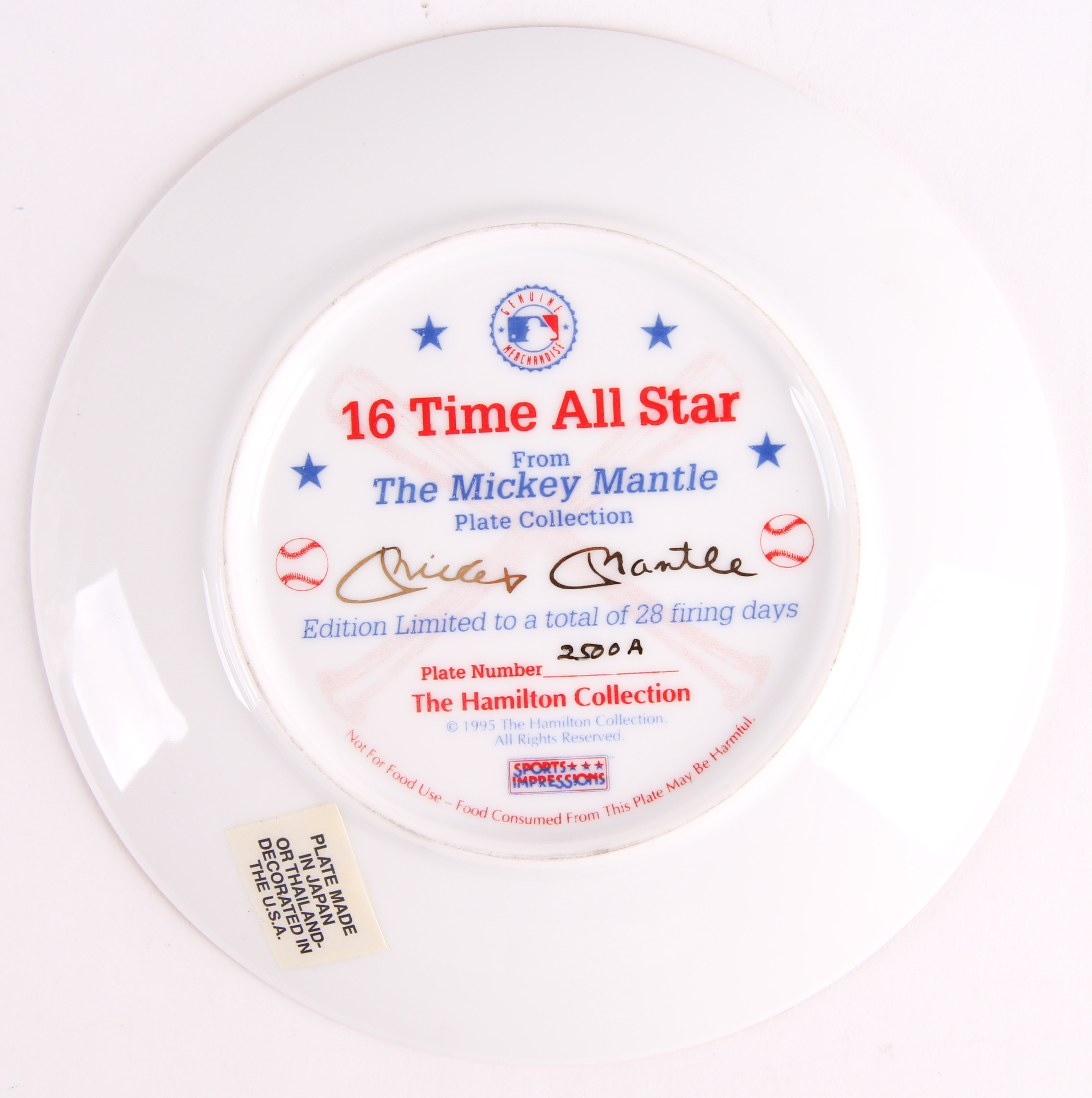 1995 Mickey Mantle Yankees LE Sports Impressions Porcelain Plate (Hamilton Collection COA)