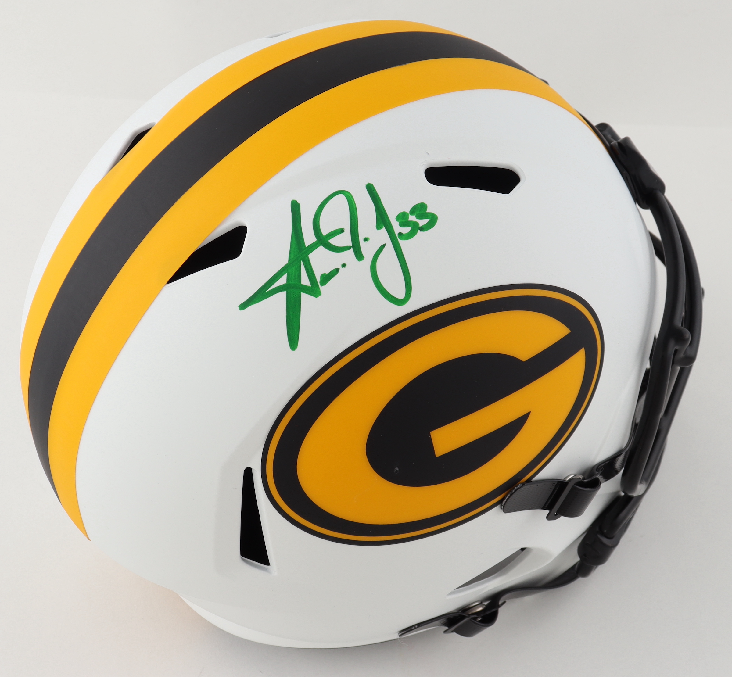 Riddell Green Bay Packers Full-Size Replica Lunar Eclipse Alternate Speed Helmet. Hand-signed by Aaron Jones.