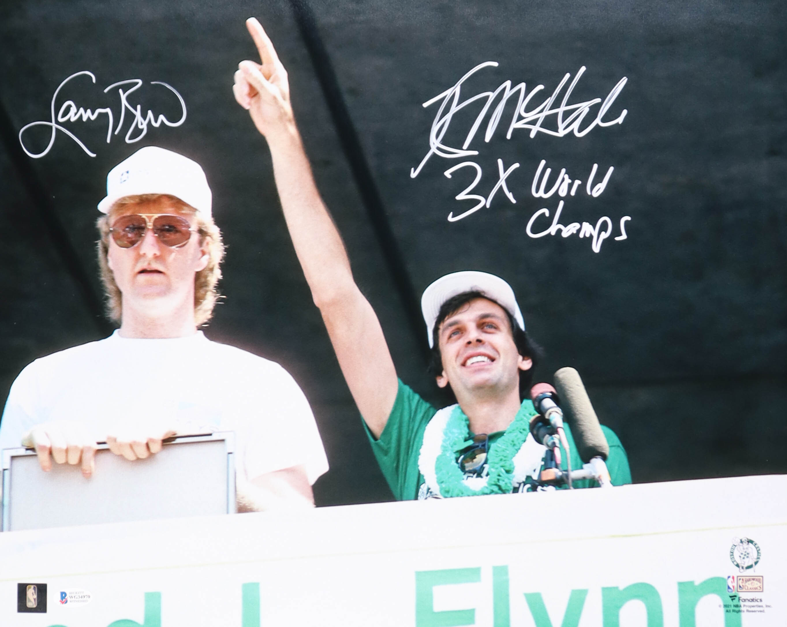 Photo measures 16" x 20" in size and has been hand-signed and inscribed by Larry Bird (HOF) and Kevin McHale (Boston Celtics, HOF).