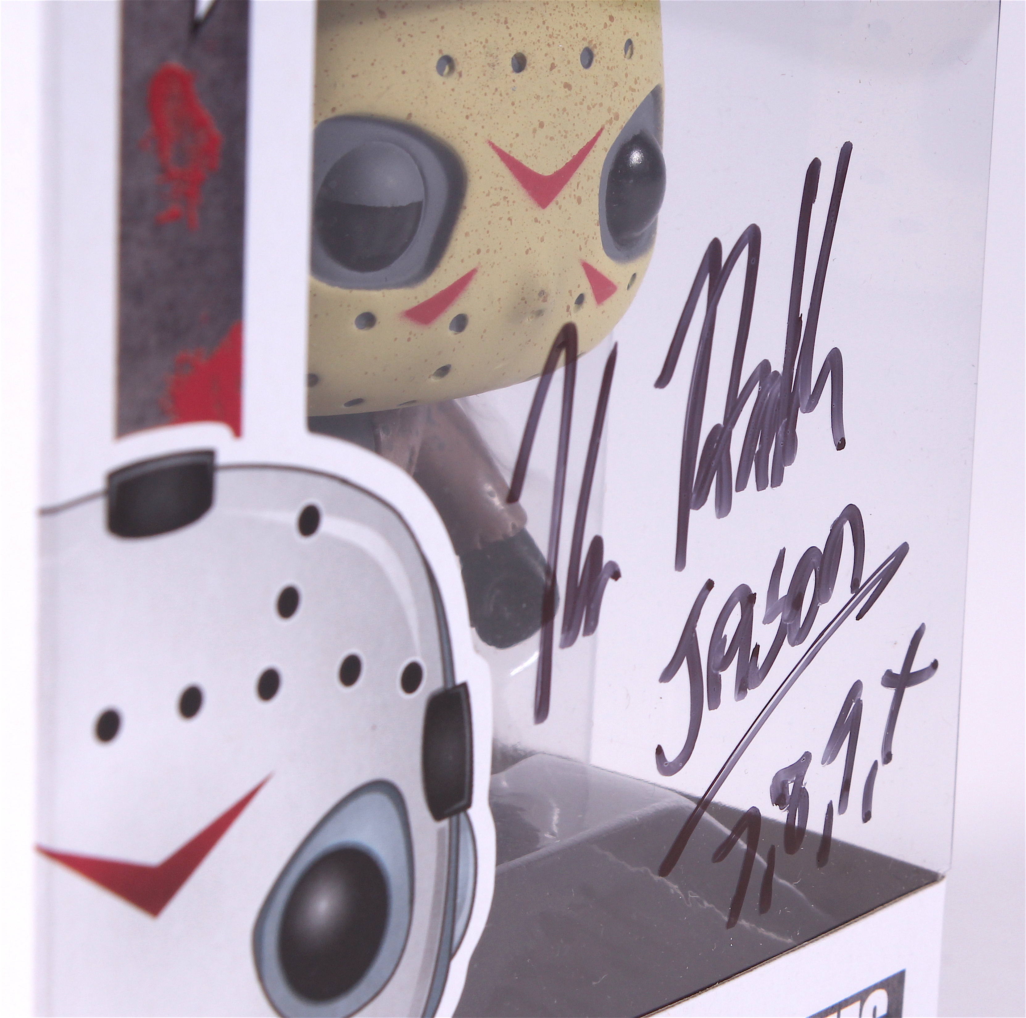 Figure measures approximately 4" tall and comes in the original box. Hand-signed and inscribed in black felt tip pen by Kane Hodder (Jason).
