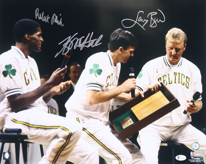 Photo measures 16" x 20" in size and has been hand-signed by Larry Bird (HOF) and Kevin McHale (HOF), and Robert Parish (Boston Celtics, HOF).