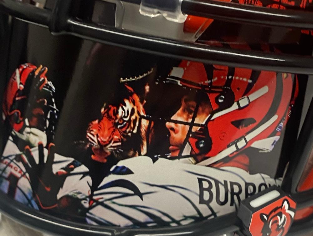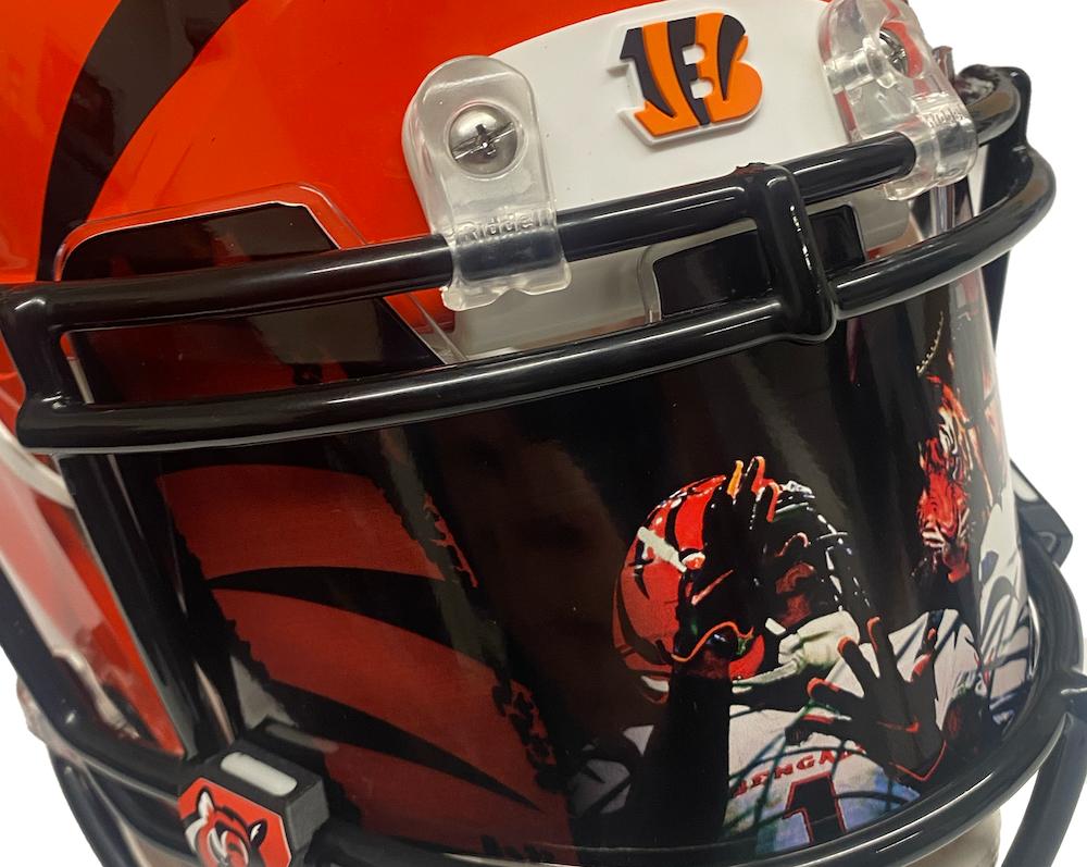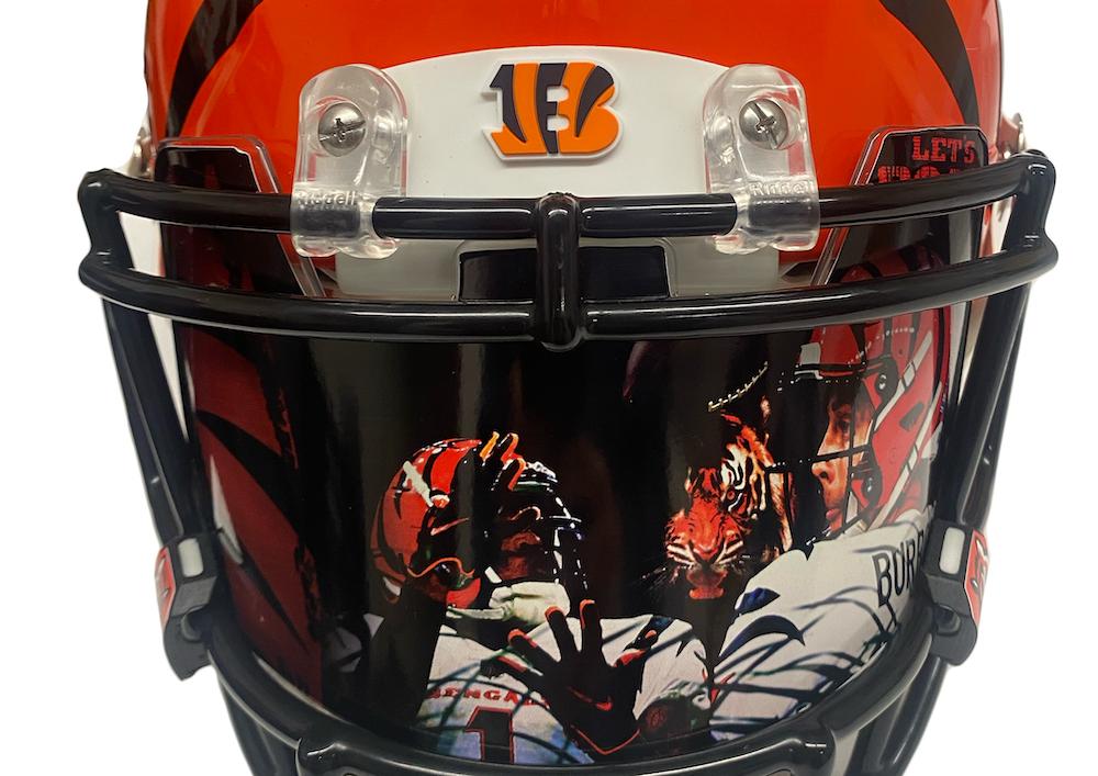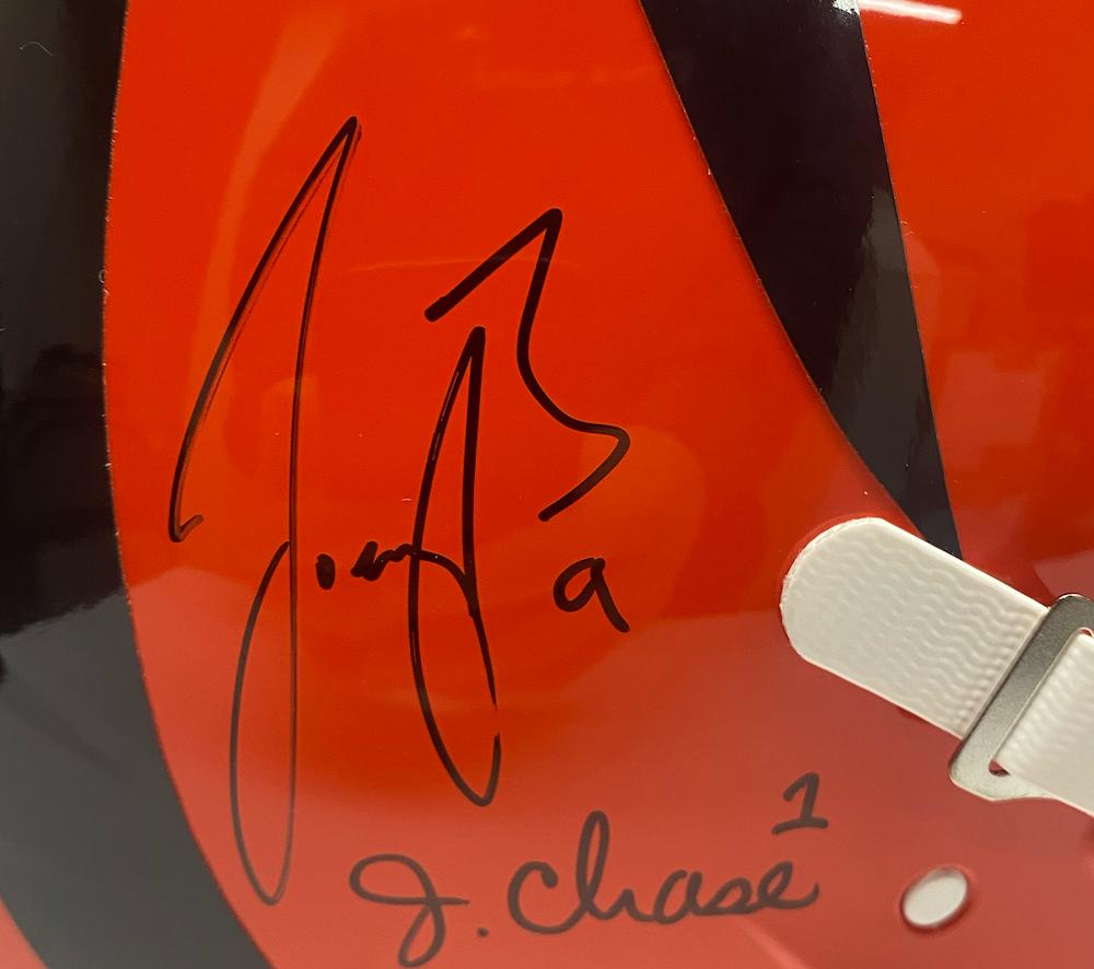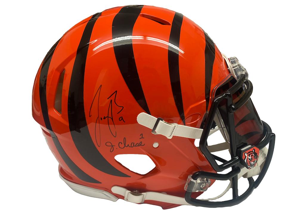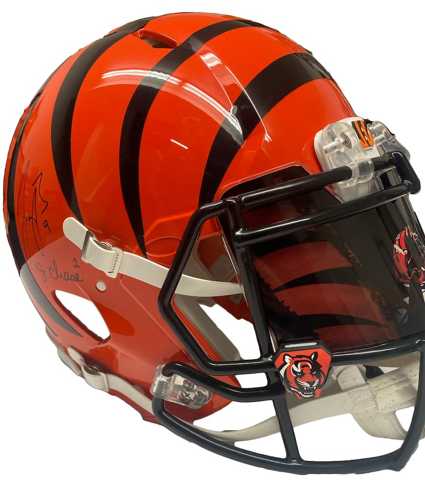 Riddell Cincinnati Bengals full-size authentic on-field Speed helmet. Hand-signed by Joe Burrow and Ja'Marr Chase. Includes custom visor.