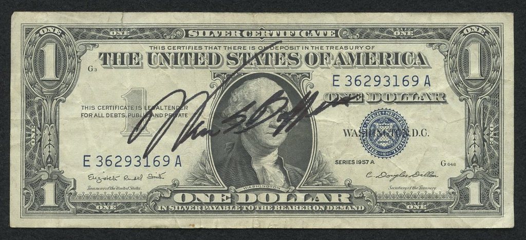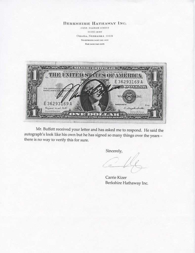 Vintage 1957 One Dollar bill hand-signed in black felt tip pen by Warren Buffett. Autographs include a letter from Carrie Kizer of Berkshire Hathaway Inc. which shows a scan of the bill and states "Mr. Buffett received your letter and has asked me to respond. He said the autograph's look like his own but he has signed so many things over the years - there is no way to verify this for sure."
