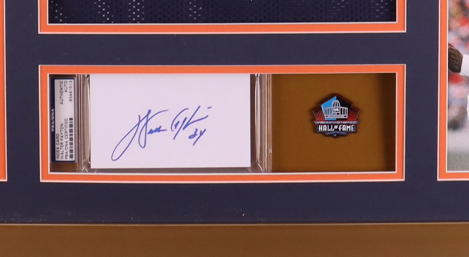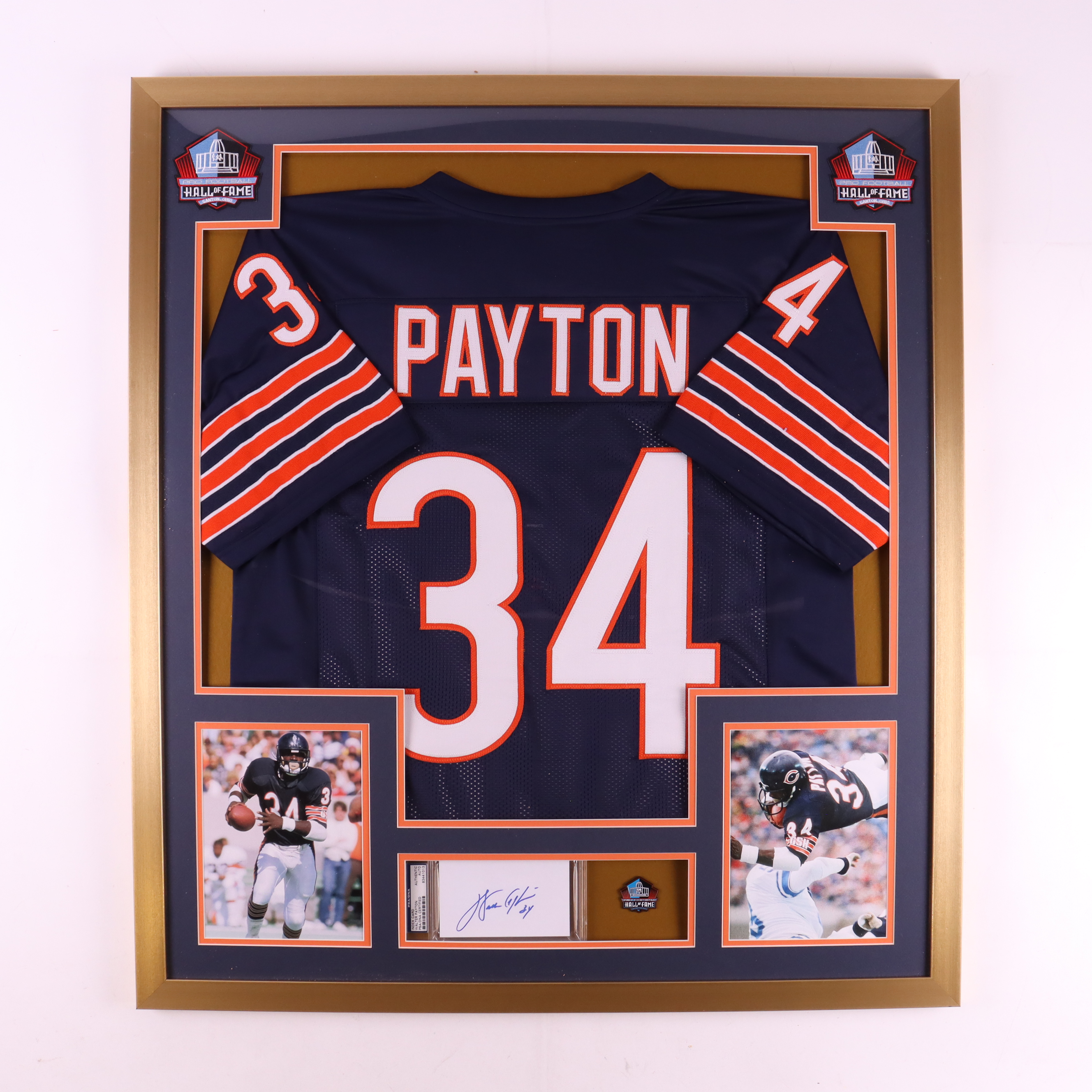 Custom frame measures approximately 32" x 36" in size and features a cut that has been hand-signed by Walter Payton (D. 1999, Chicago Bears, HOF), as well as an unsigned jersey and an official Hall of Fame pin.