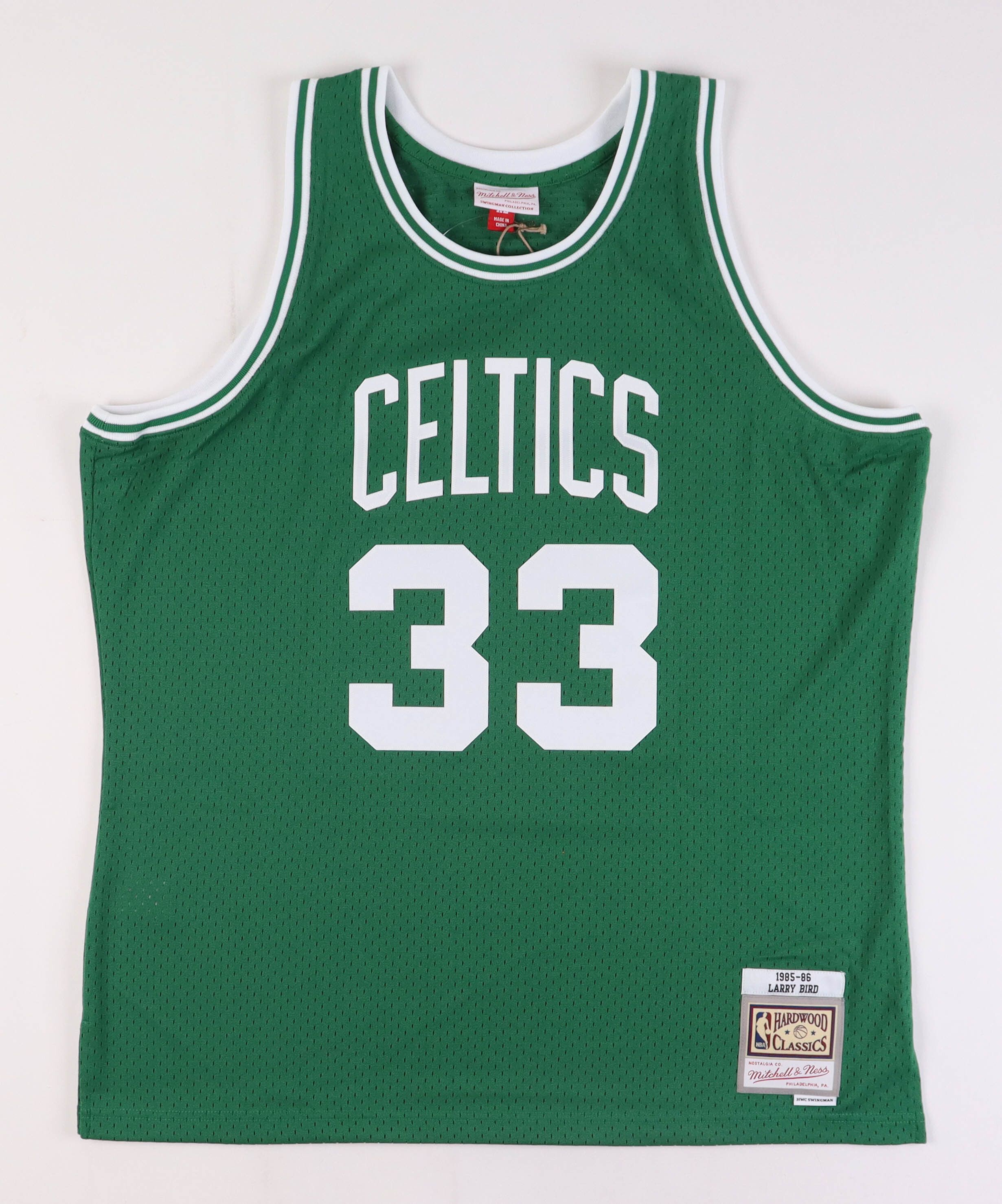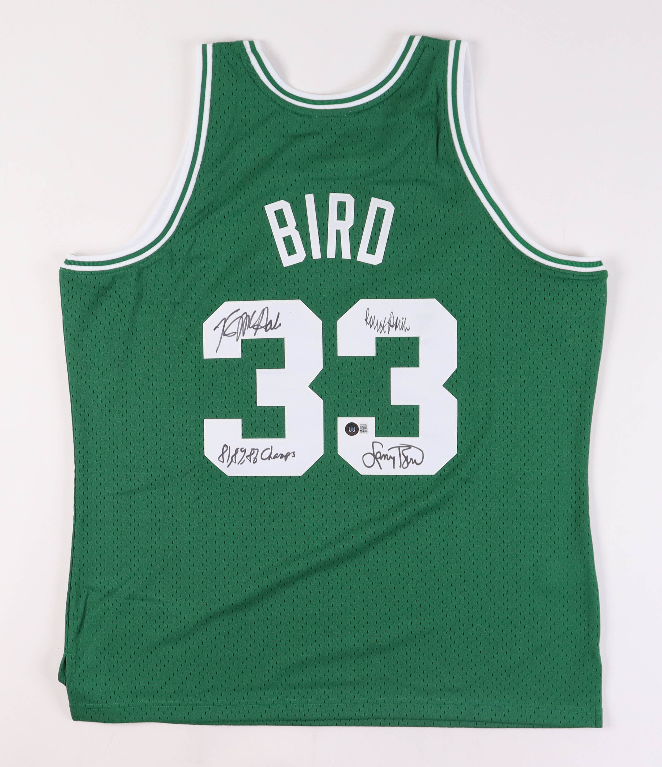 Mitchell & Ness on-court style jersey. Everything is sewn on, size XL. Hand-signed and inscribed by Larry Bird (HOF), Kevin McHale (HOF) and Robert Parish (HOF).