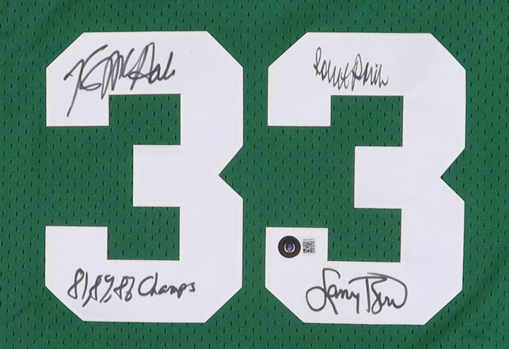 Larry Bird, Kevin McHale & Robert Parish Signed Celtics Jersey Inscribed "81, 84, 86 Champs" (Beckett)
