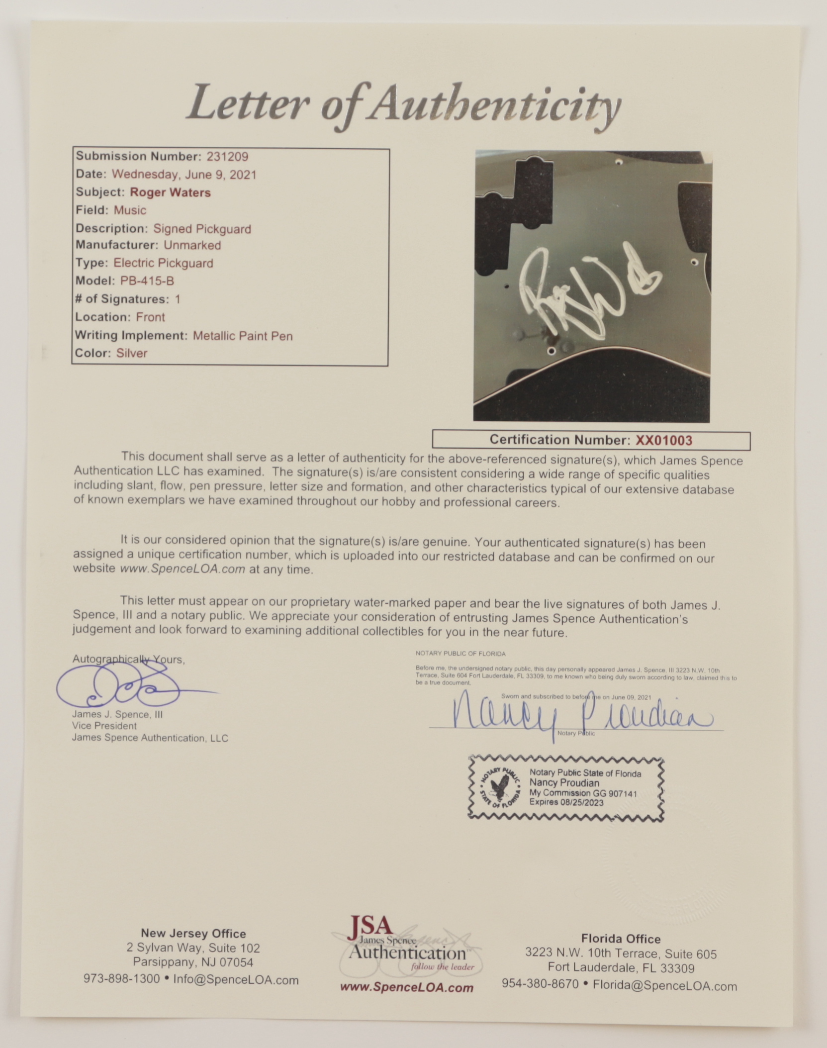 Electric guitar has been hand-signed on the pick guard by Roger Waters and Nick Mason.