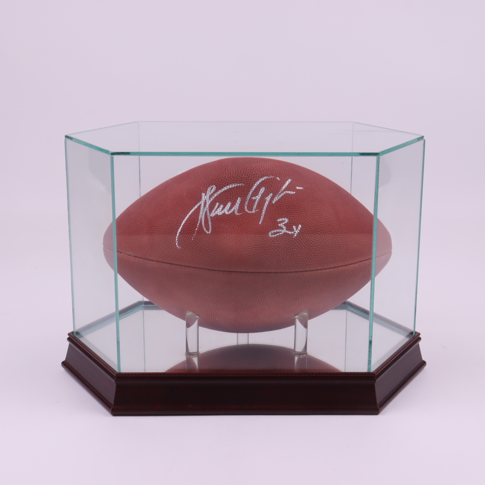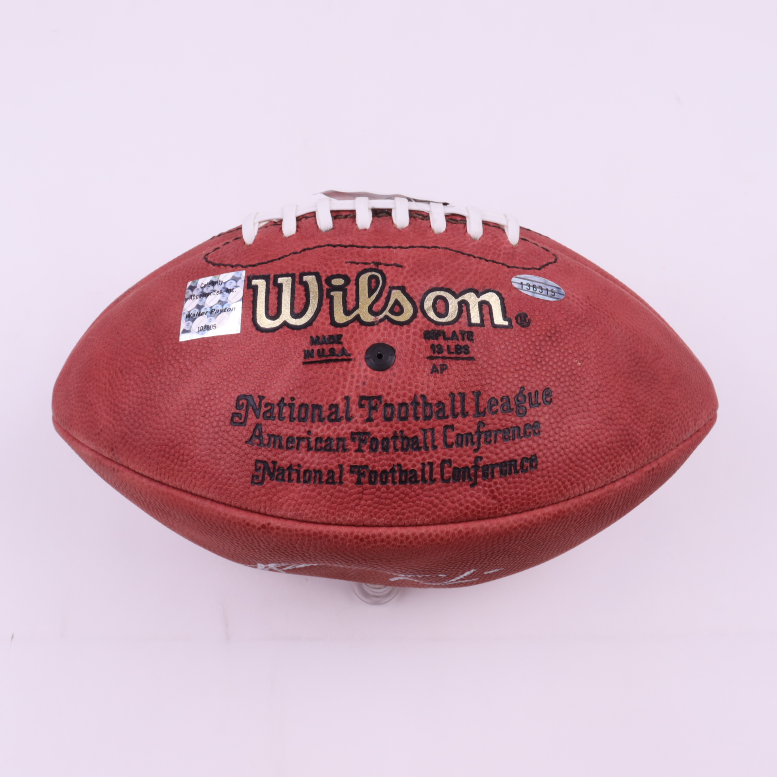 Wilson Official NFL football. Hand-signed by Walter Payton (D.1999, Chicago Bears, HOF). Glass display case is included as shown.